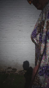 Love Heart Sequin V-Neck Kaftan Gown in gold, purple, silver, and iridescent colourway. Worn with our hidden ribbons tied to cinch in at the waist (can also be worn loose).