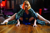 This elegant kimono radiates opulence and sophistication with its luxurious, flowing design. Crafted from rich blue velvet fabric, the kaftan is adorned with intricate Mint green floral embroidery and sequins and finished with hand stitching down the front seams