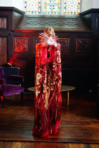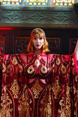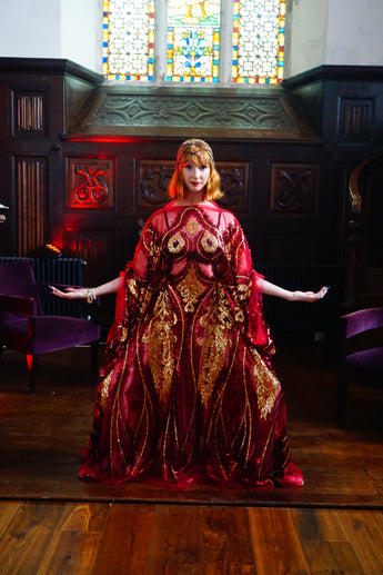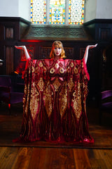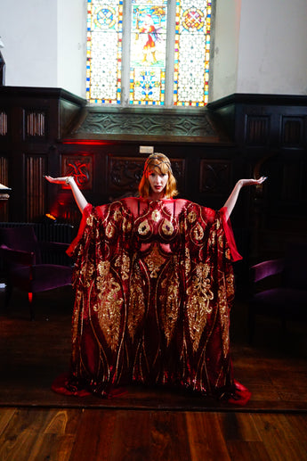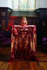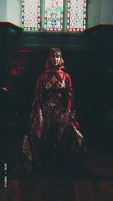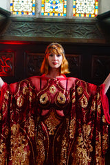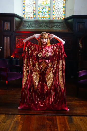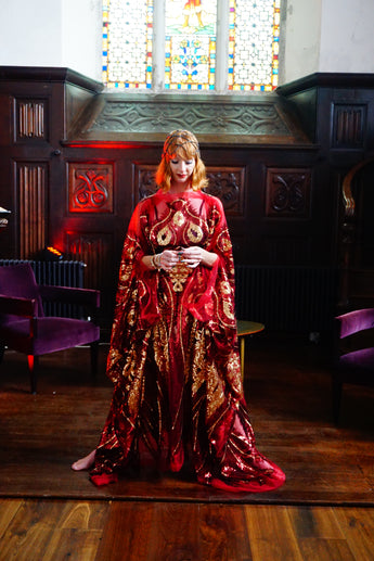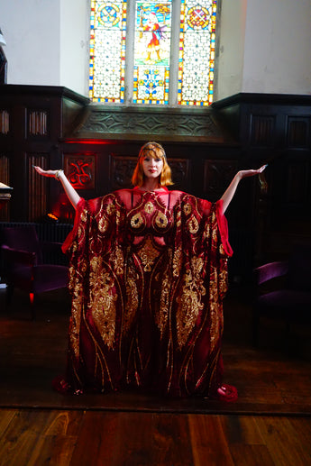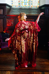 This stunning kaftan gown features a beautiful combination of red and gold, exuding the elegant vibes of Sacre Coeur.