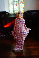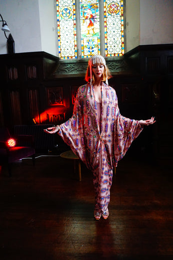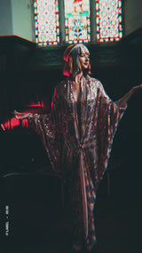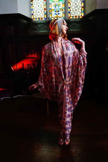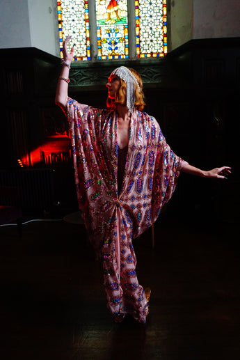 Art nouveau-inspired pink and blue iridescent jewelled sequin and Kimono Robe - set on a mesh base with no fastenings or fixtures with a stunning geometric diamond pattern of iridescent jewelled sequins in shades of pink and blue on a nude mesh.