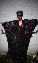 Flower pattern luxe sequin V-Neck Kaftan Gown in midnight blue, green, bronze, and gold colourway. Worn with our hidden ribbons tied to cinch in at the waist (can also be worn loose).