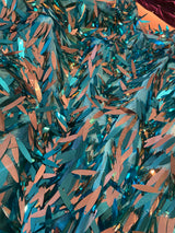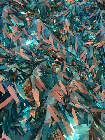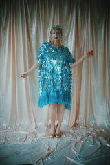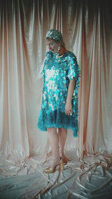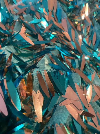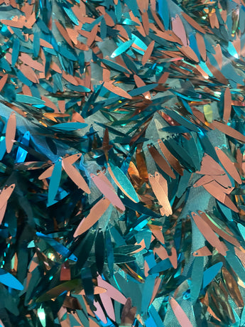 Mini round neck gold and ice blue long oval shaped sequin shards on a mesh base. Still a free-size but not as roomy as normal…