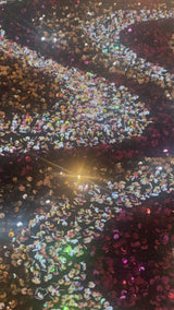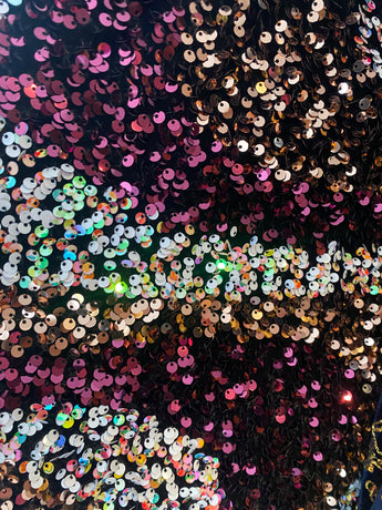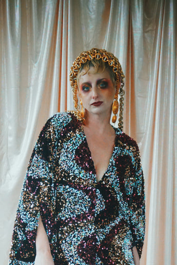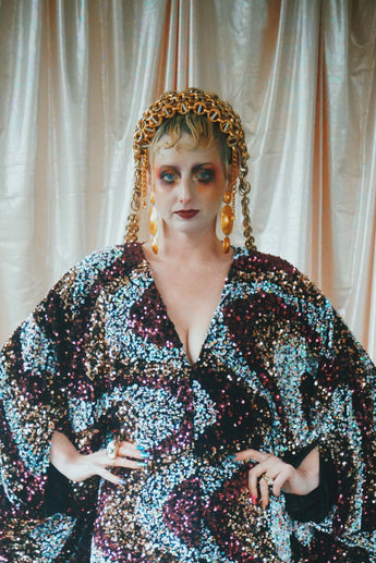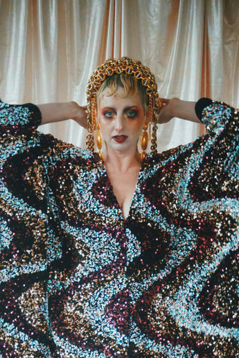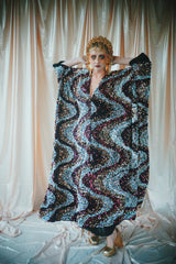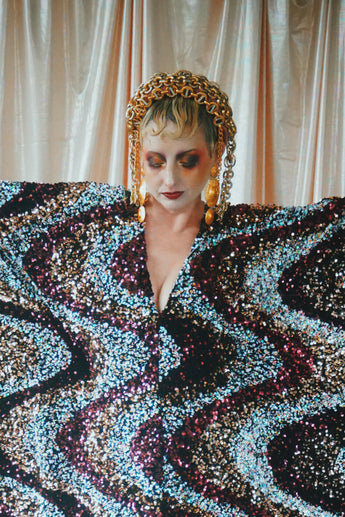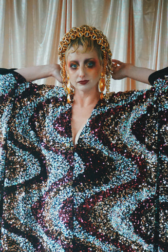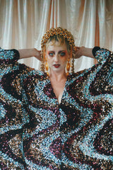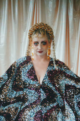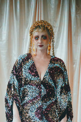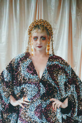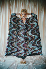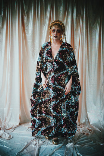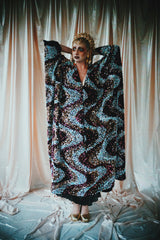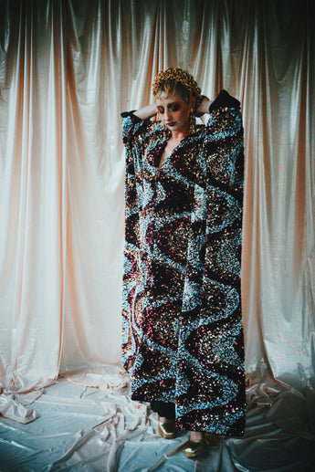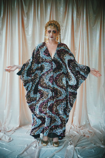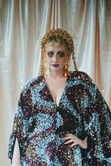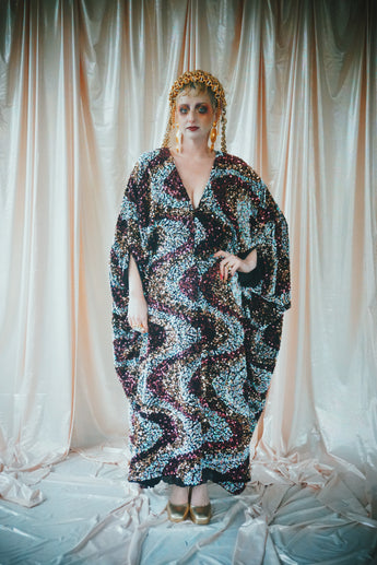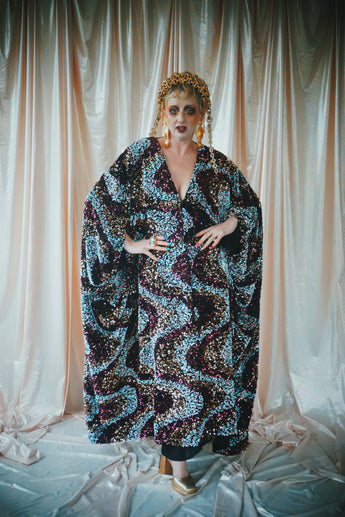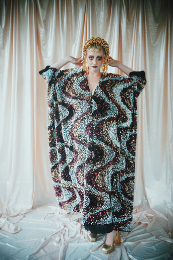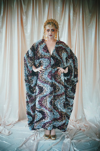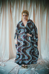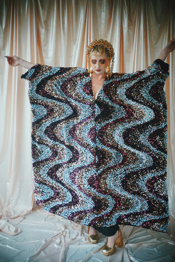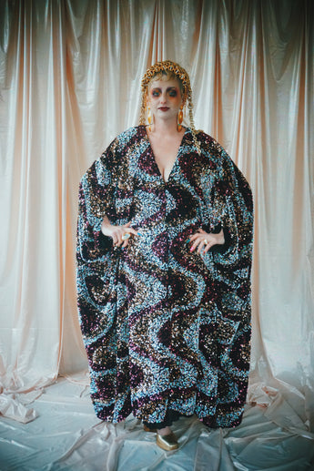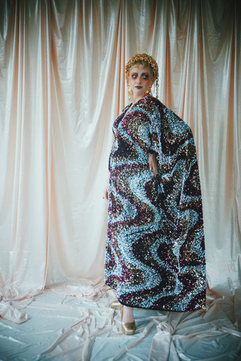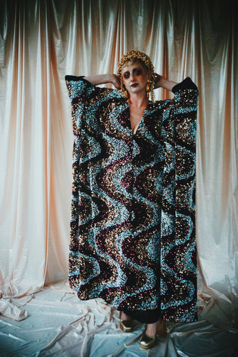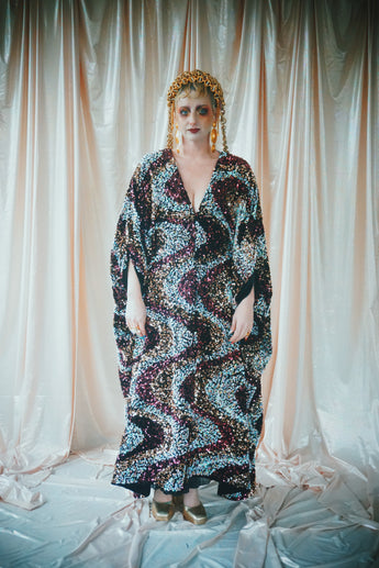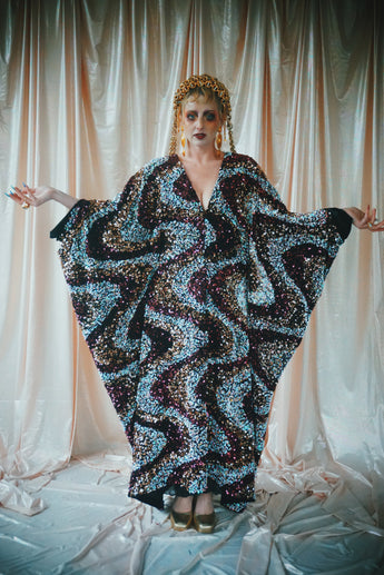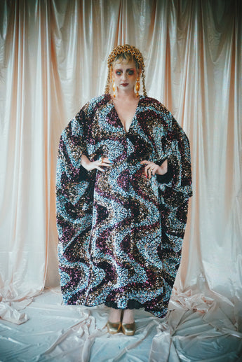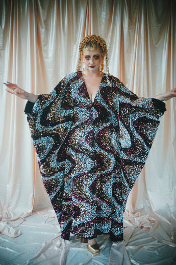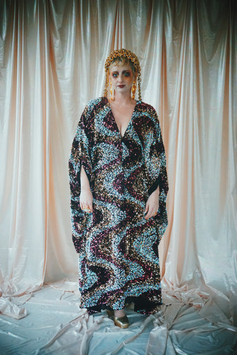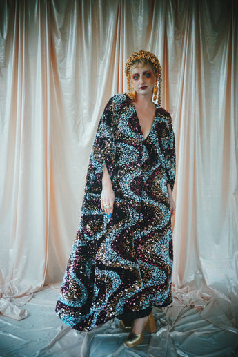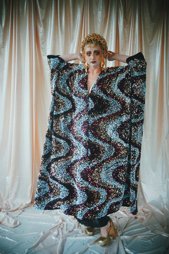 Incredible swirl design in a smothering of coloured sequins on a black velvet base…. Here in our v-neck kaftan with hidden ribbons.