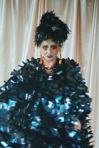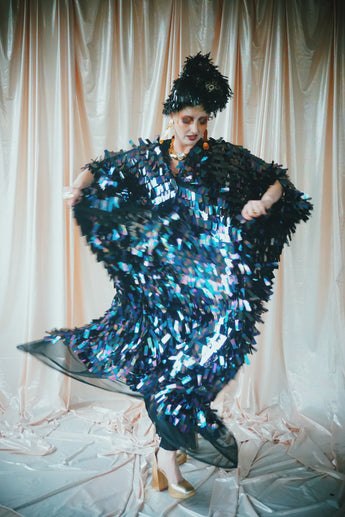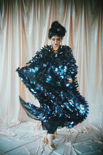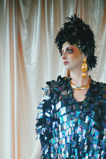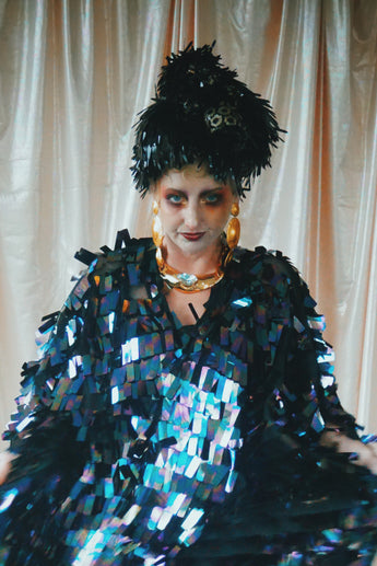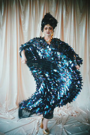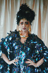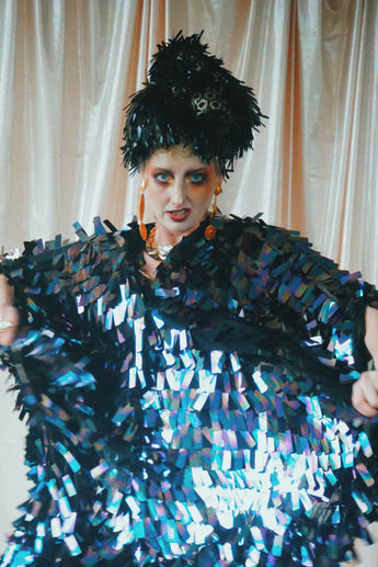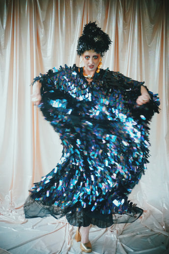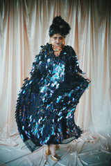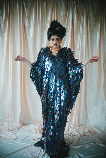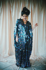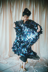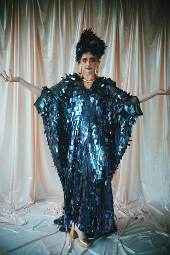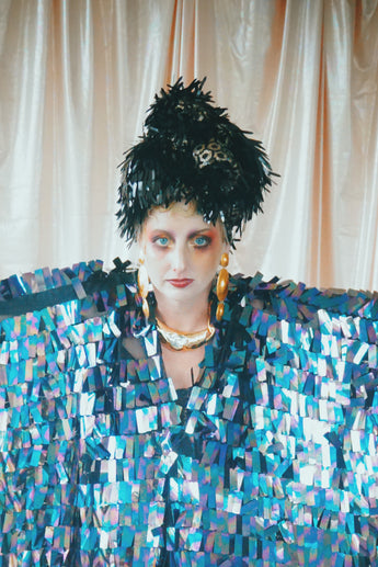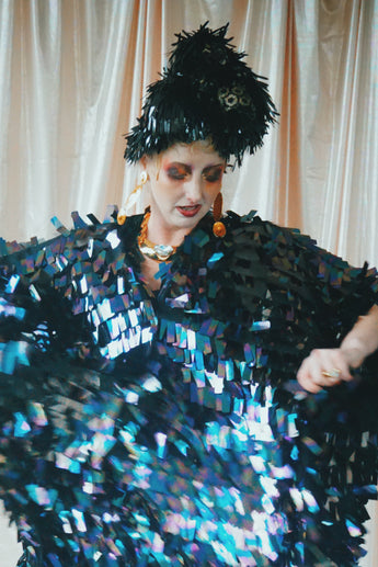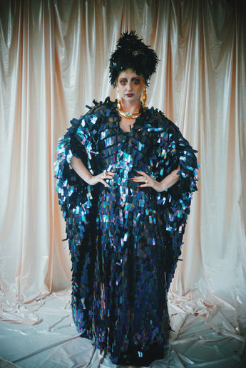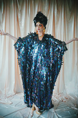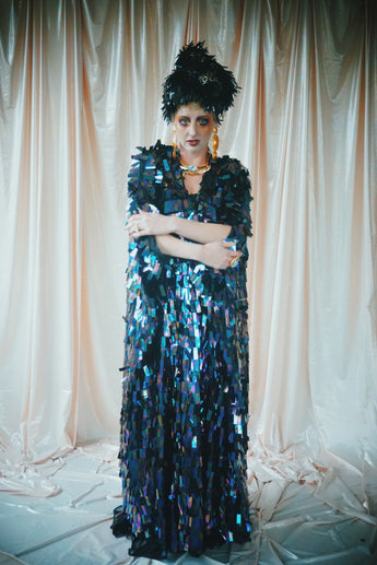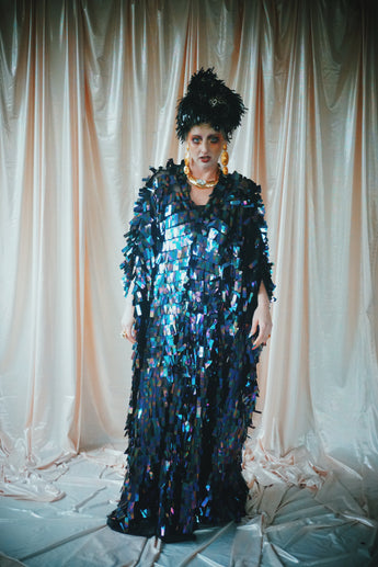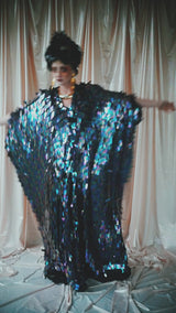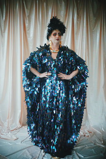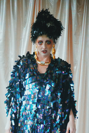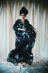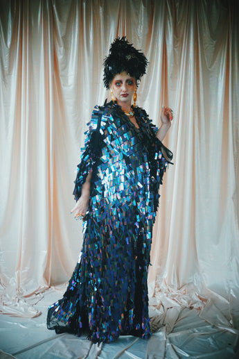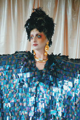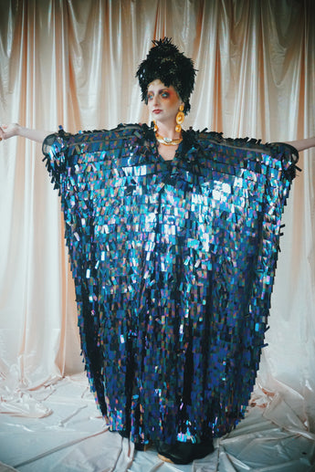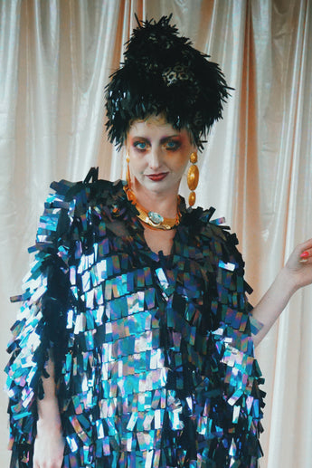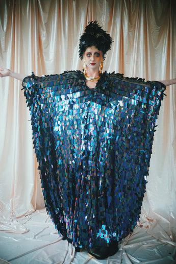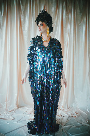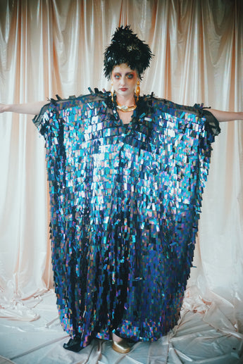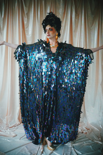 Showstoppingly large petrol/holographic rectangular sequins on a mesh base. Lightweight and longer in length.