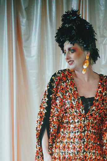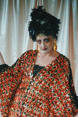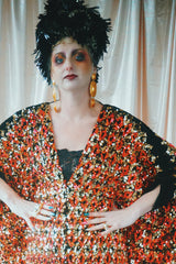 Hot pink and punchy gold slathering of sequins in a diamond pattern on a thick black soft velvet base