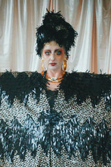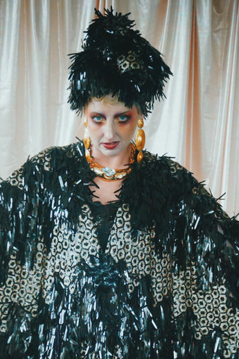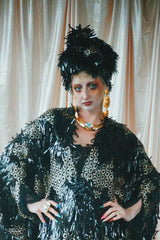 A truly incredible one of a kind sequinned gown in black sequins with patterns of hexagonal gold embroidery and long sequin mirror shards.