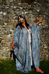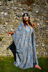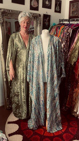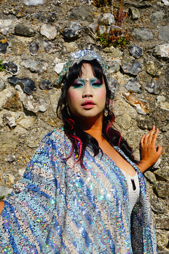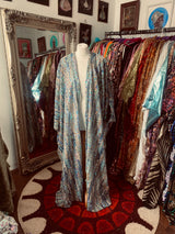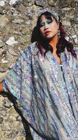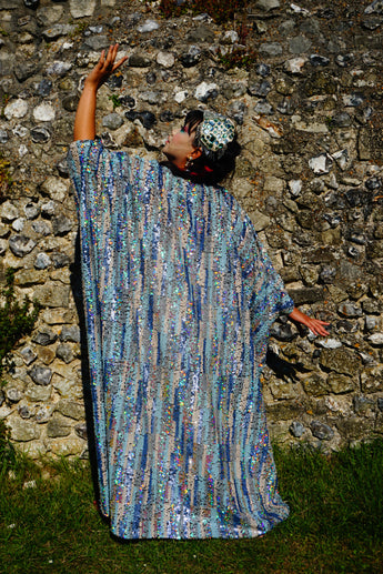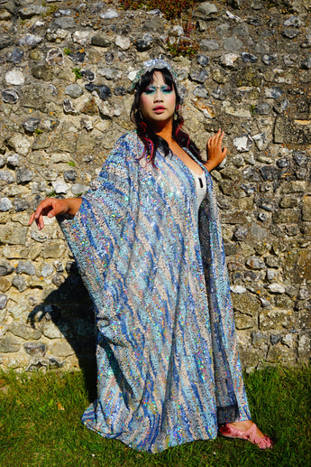 Introducing our Ocean Blues silver iridescent sequin Gown / Robe, made on a black mesh base with shimmering and sparkling iridescent, pearl, silver and blue sequins.