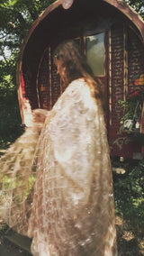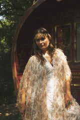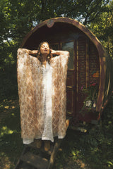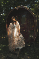 The Golden Diviner Sequin Kimono Robe. Sheer mesh kimono robe adorned with gold sequin fringe panels arranged in a diamond lattice pattern. Worn with our Moonrise White Lace Kaftan Gown.