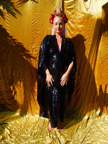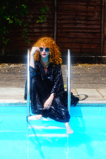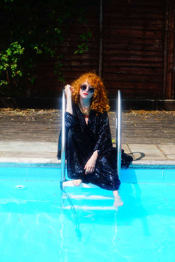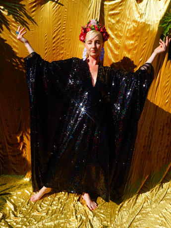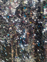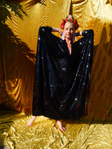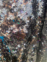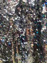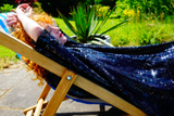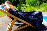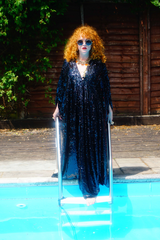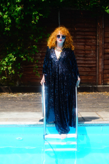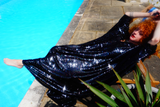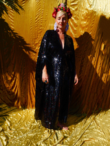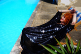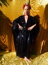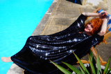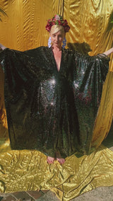 Petrol Black Holographic Sequin Maxi Kaftan Gown or Kimono Robe. These sequins are a heavy weight on a mesh base with some stretch. The style pictured is a V-neck plunge - we can also make in our slash neck style (see here) if you wish for this style please add it to your order notes when checking out.