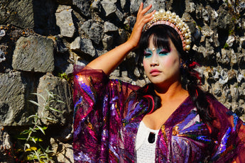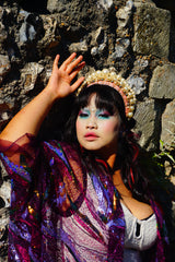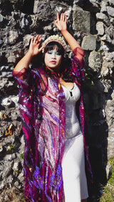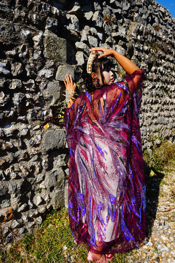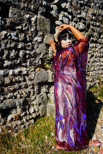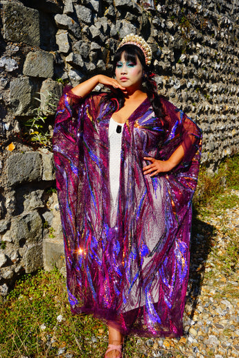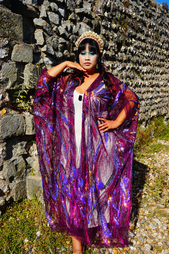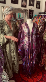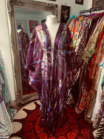 Purple Sheer Sequinned patterned Kimono Robe.