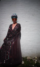 Rainbow sequin knit V-Neck Kaftan Gown. This kaftan gown can be worn in two different ways - loose, or cinched at the waist with hidden ribbons. Please note there are some damage (see video). - Damage - ripped mesh, missing sequins etc. Only noticable on inspection