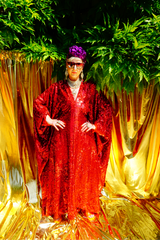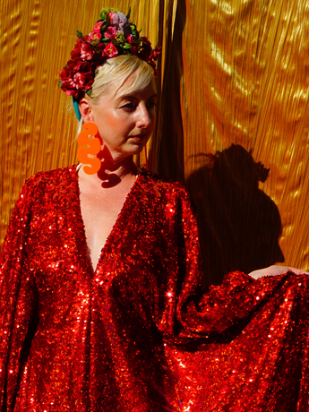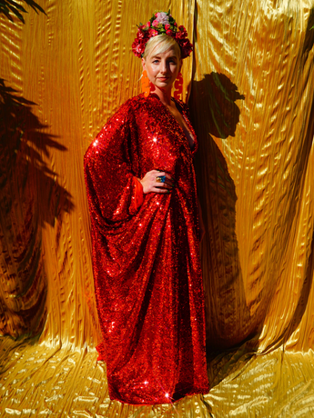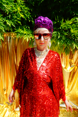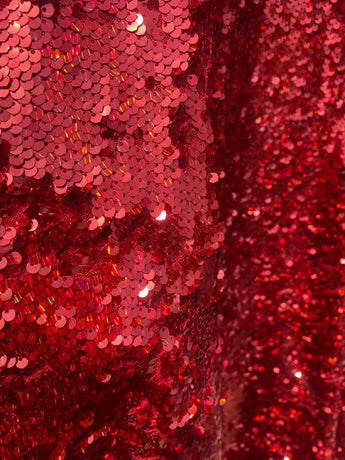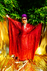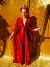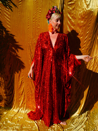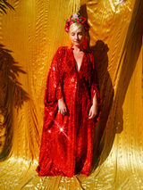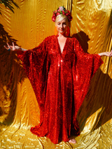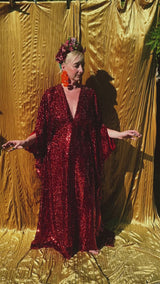 Ruby Red Holographic Sequin Maxi Kaftan Gown or Kimono Robe. These sequins are a heavy weight on a mesh base with some stretch. The style pictured is a V-neck plunge - we can also make in our slash neck style (see here) if you wish for this style please add it to your order notes when checking out.