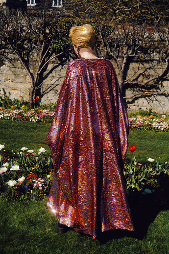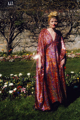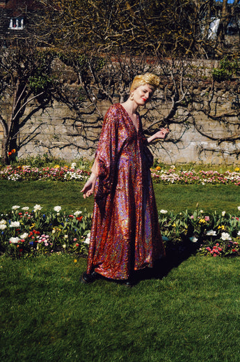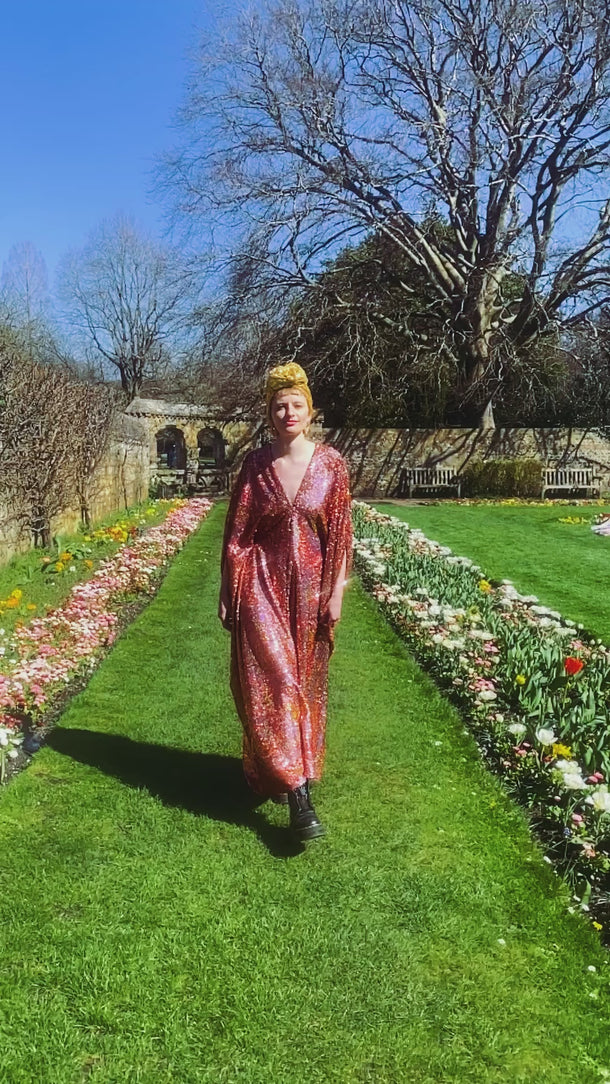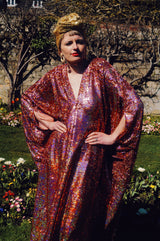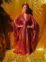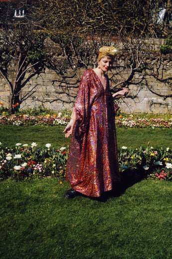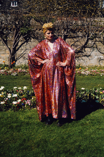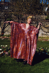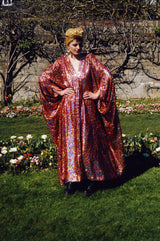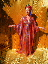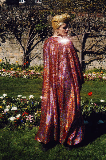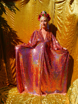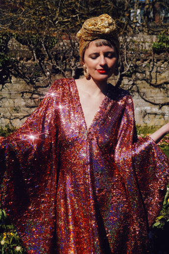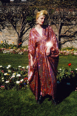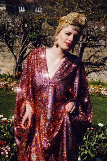 Rose Gold Holographic Sequin Maxi Kaftan Gown or Kimono Robe. These sequins are a heavy weight on a mesh base with some stretch. The style pictured is a V-neck plunge - we can also make in our slash neck style (see here) if you wish for this style please add it to your order notes when checking out.