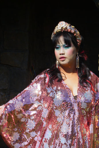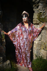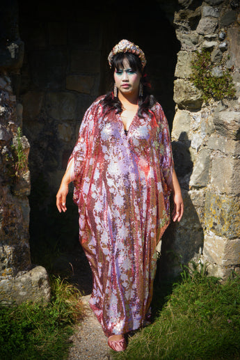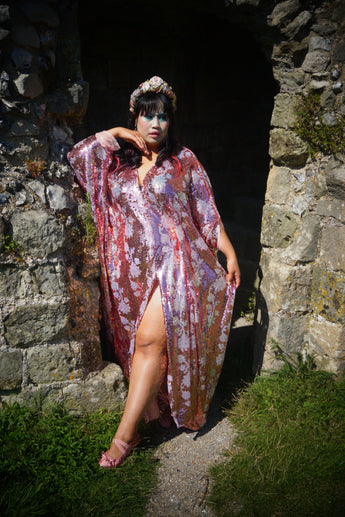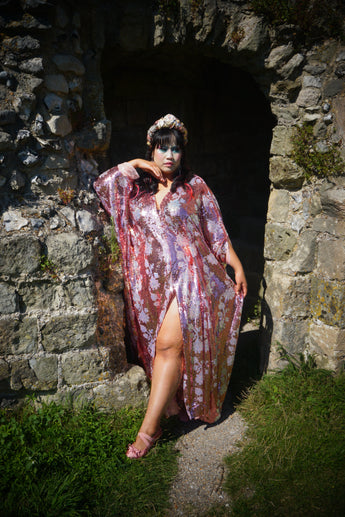 Indulge in opulence and elegance with our Rose sequin and floral iridescent Thigh high split V-neck Kaftan gown. The intricately designed sequins and floral details will make you turn heads while the high split adds a touch of allure.