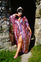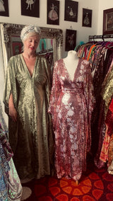Fitted with hidden velvet ribbons on the inside meaning you can wear them two ways - 1) Free, loose and baggy, and 2) with the ribbons tied at the waist to pull the dress in and frame your figure.