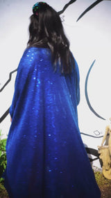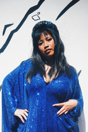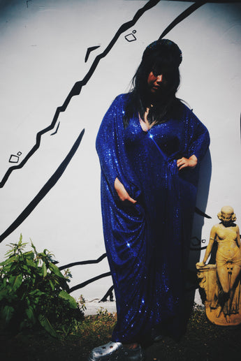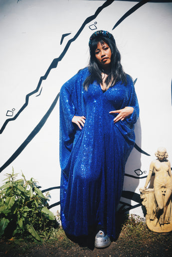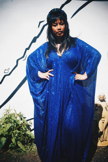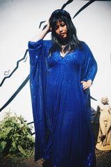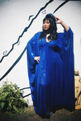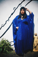 Royal Blue Sequinned knit V-Neck Kaftan Gown with stretch and a slight sheerness. Lightweight. Worn with our hidden ribbons tied to cinch in at the waist (can also be worn loose).