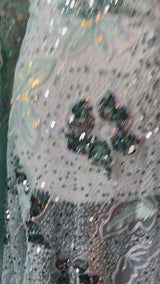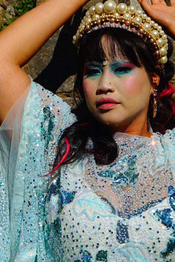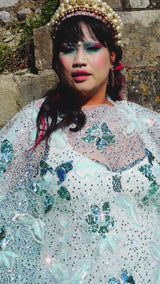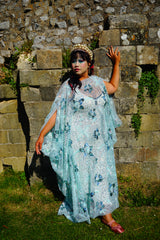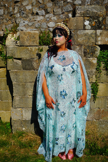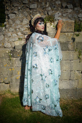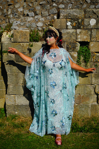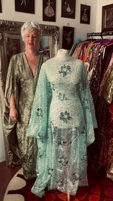 A sensational arrangement of sequins and embroidered flowers in mint green and iridescent colours. Extra wide with large cuff holes for more drape and gathering of fabric. The dress is quite sheer and Worn here with a nude fitted dress underneath to add to the illusion of the dripping of the sparkles, however you can wear with a white slip or maxi dress or even another kaftan underneath if you prefer to be more covered up. Worn with our hidden ribbons tied to cinch in at the waist (can also be worn loose).