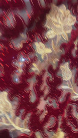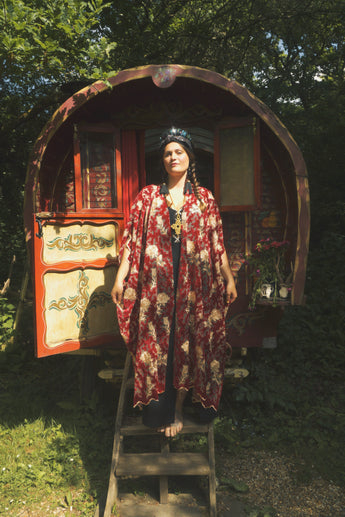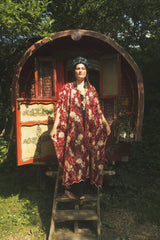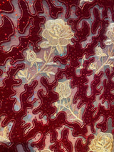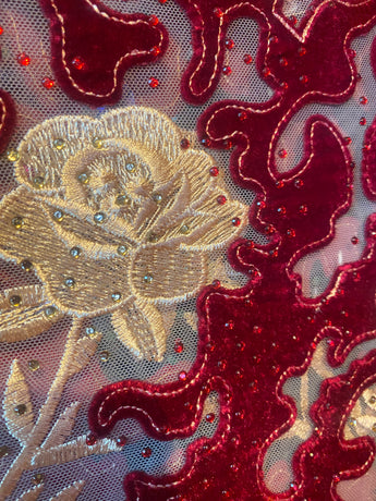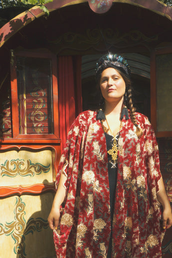 Crimson Oracle Sequin Velvet Kimono Robe with gems smothered throughout and a scalloped edges. Hand stitched down the front hems. Worn with a vintage slip underneath.