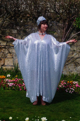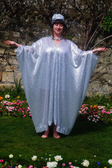 Free size (with full measurements below) and the kaftan dress style is fitted with hidden velvet ribbons on the inside meaning you can wear them two ways - 1) Free, loose and baggy, and 2) with the ribbons tied at the waist to pull the dress in and frame your figure.