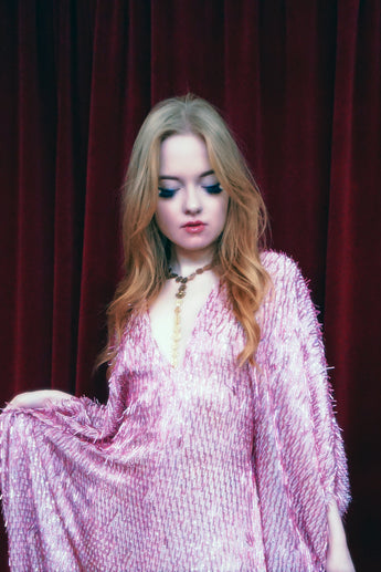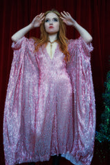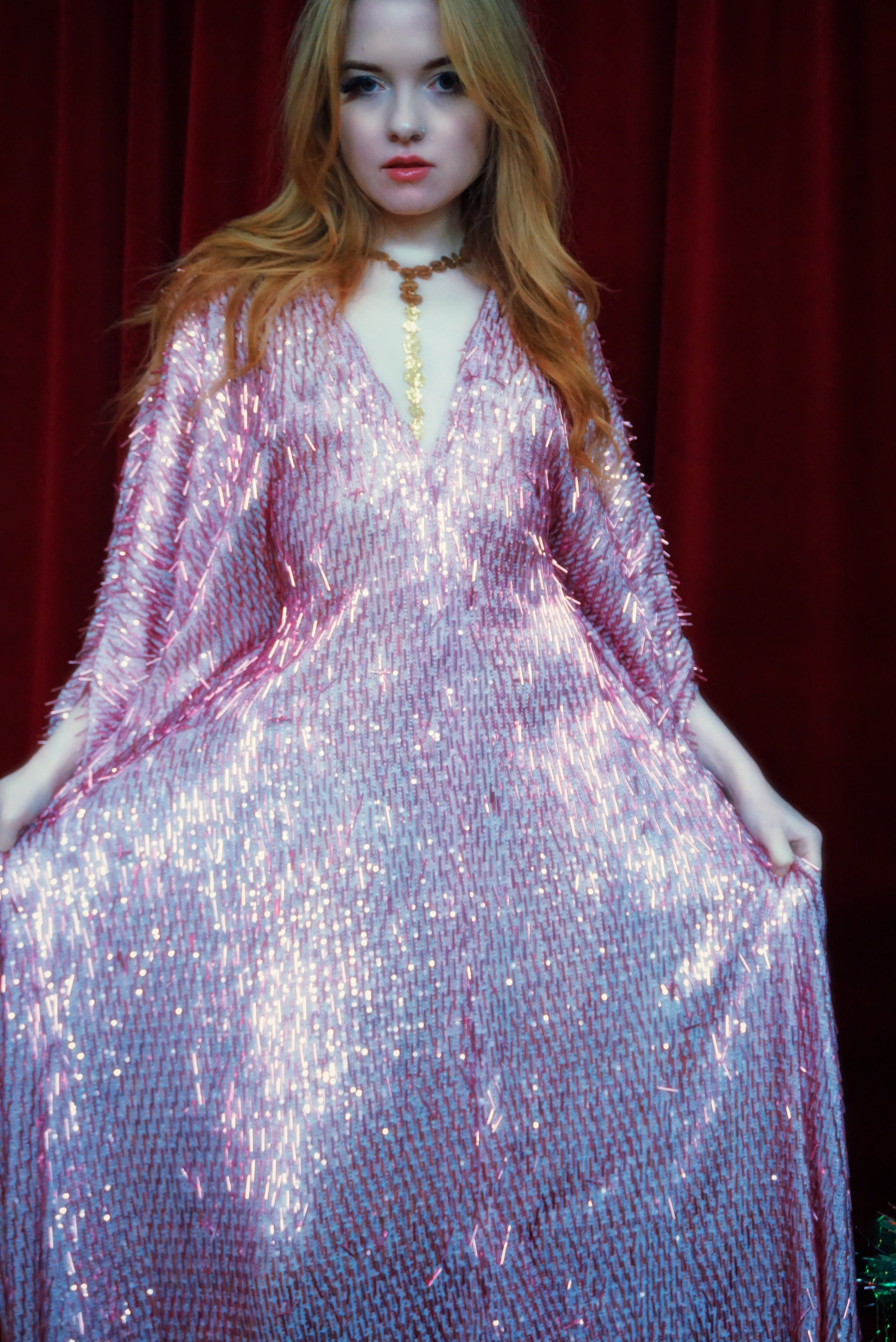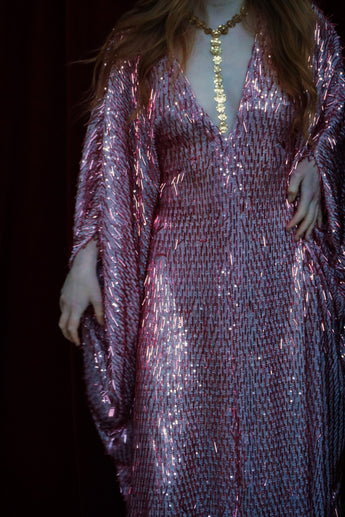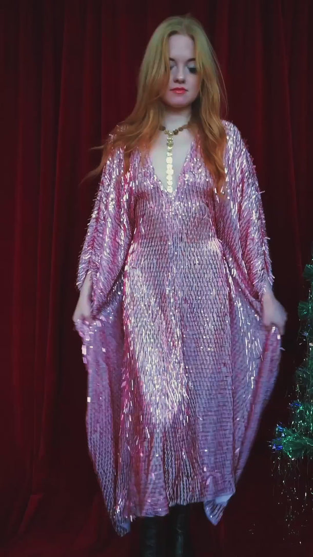 Ice pale Pink Crystal like Sequin V-Neck Kaftan Gown. Crafted from pale pink reflective shard like long icicle sequins fabric that shimmers as you move. Surprisingly lightweight