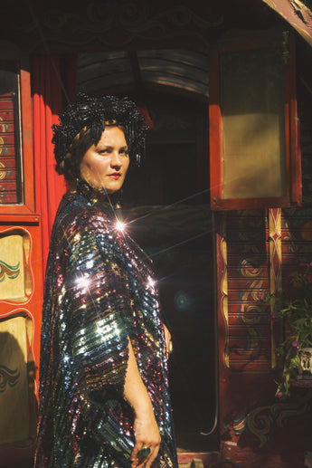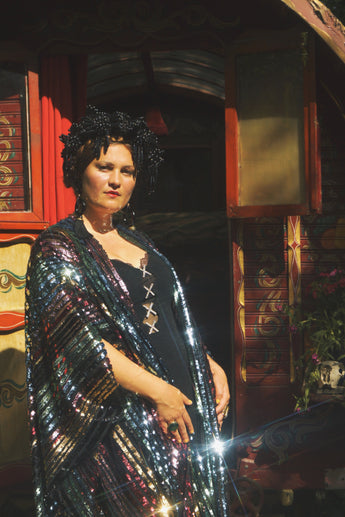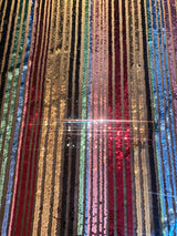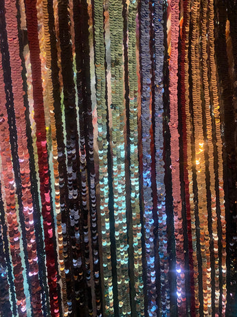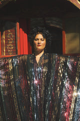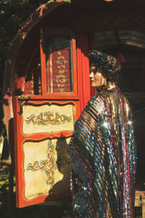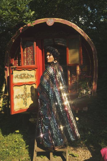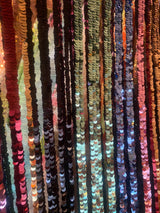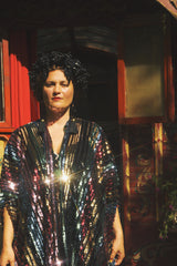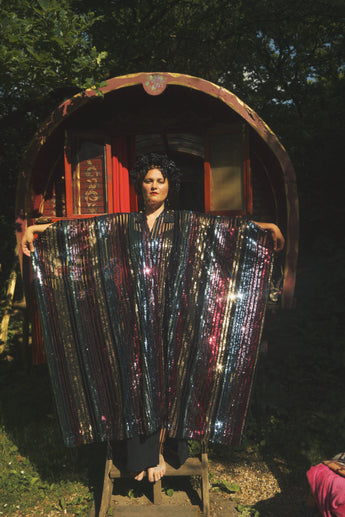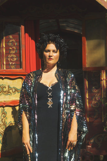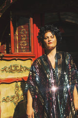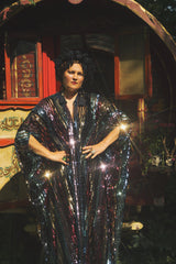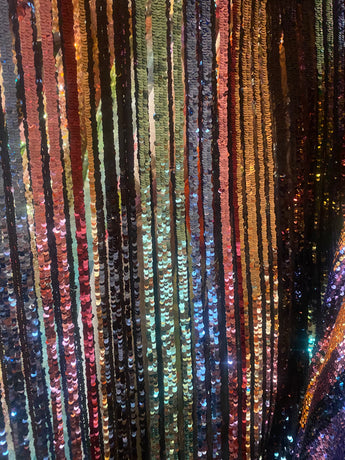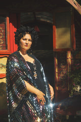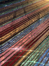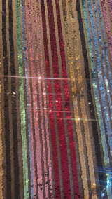 Mystic Disco Striped Sequin Kimono Robe. Rich plush sequins on a chiffon black base. Semi-Sheer Worn with a vintage slip underneath.