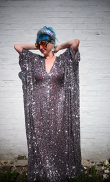 Dark Silver Sequin V-Neck Kaftan Gown. Semi Sheer. Worn with our hidden ribbons tied to cinch in at the waist (can also be worn loose).