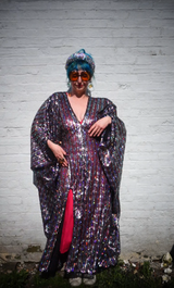 Silver Chevron Sequin V-Neck Kaftan Gown with front split. Mesh based and unlined. Worn with our hidden ribbons tied to cinch in at the waist (can also be worn loose).