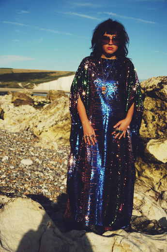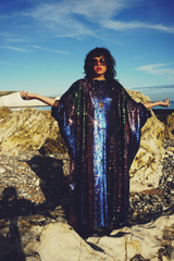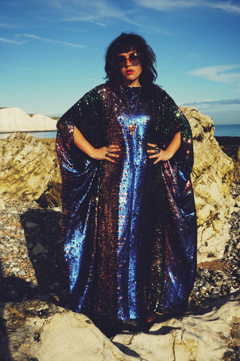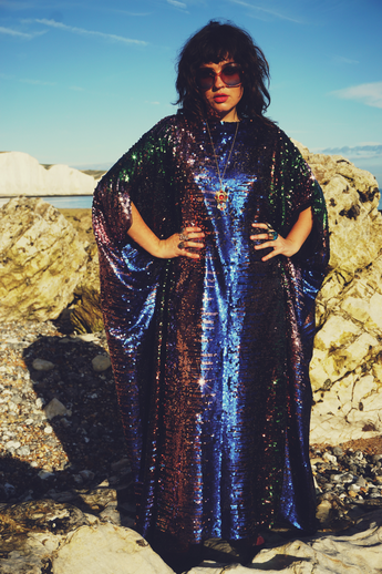 Our kaftan dresses are uniquely fitted with hidden velvet ribbons on the inside meaning you can wear them two ways - 1) Free, loose and baggy, and 2) with the ribbons tied at the waist to pull the dress in and frame your figure.
