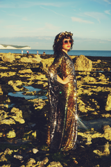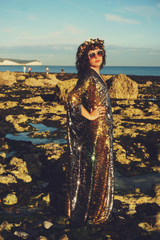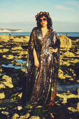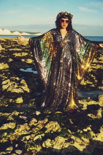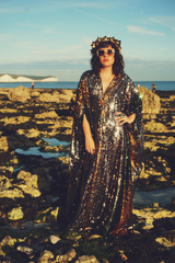 Luxurious medium weight sequins consisting of a “waterfall” pattern in sequins in Bottle Green, Gunmetal Grey and Gold on a black mesh base in our V-neck Style Kaftan gown and our signature hidden ribbons.