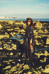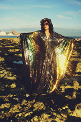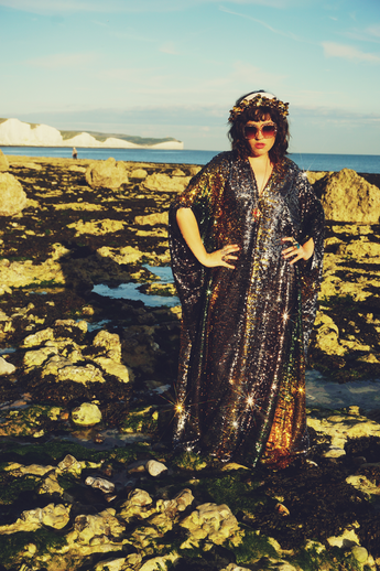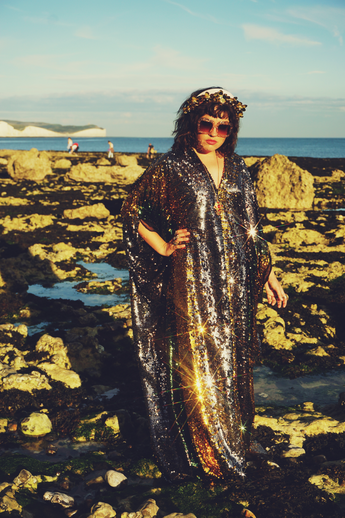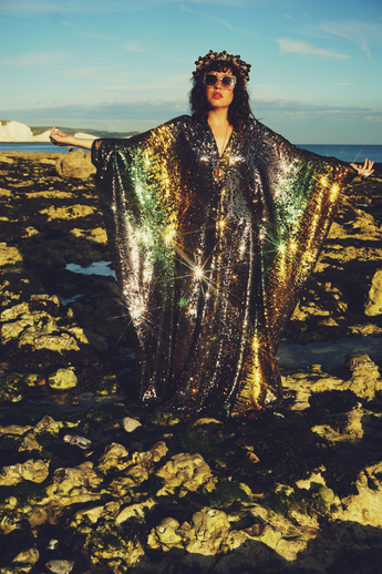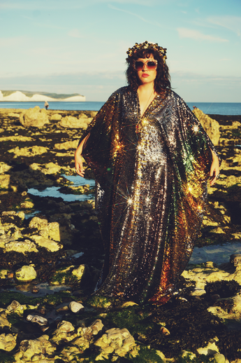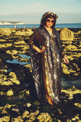 Our kaftan dresses are uniquely fitted with hidden velvet ribbons on the inside meaning you can wear them two ways - 1) Free, loose and baggy, and 2) with the ribbons tied at the waist to pull the dress in and frame your figure.