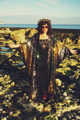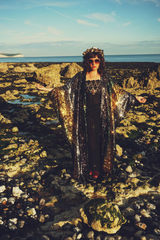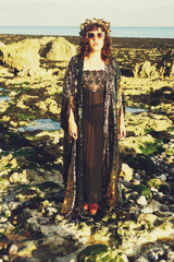 Luxurious medium weight sequins consisting of a “waterfall” pattern in Bottle Green, Gunmetal Grey and Gold on a black mesh base in our Kimono Robe Style, with or without extra fastenings and ribbons