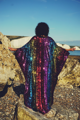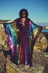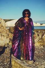 Luxurious medium weight sequins consisting of a “waterfall” pattern in sequins in magenta pink, Gold, turquoise blue and ruby red on a black mesh base in our  V-neck Style Kaftan gown and our signature hidden ribbons.
