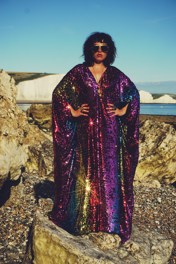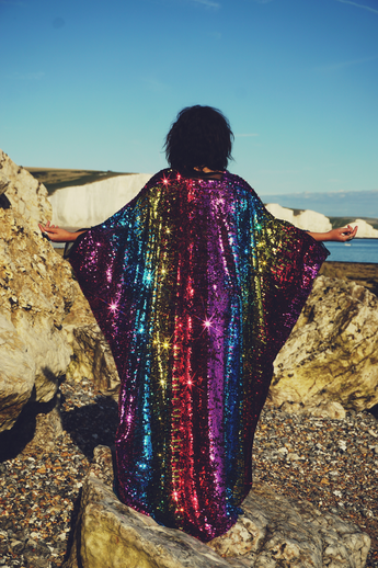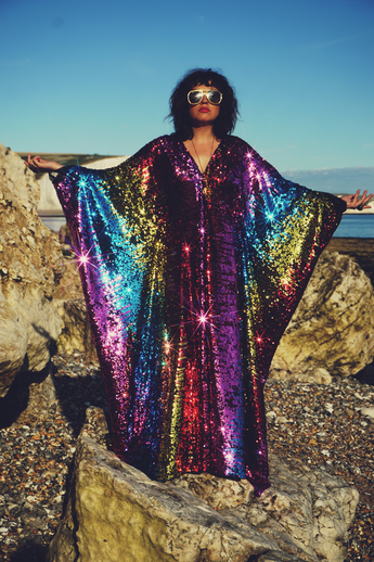 Our kaftan dresses are uniquely fitted with hidden velvet ribbons on the inside meaning you can wear them two ways - 1) Free, loose and baggy, and 2) with the ribbons tied at the waist to pull the dress in and frame your figure.
