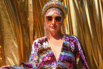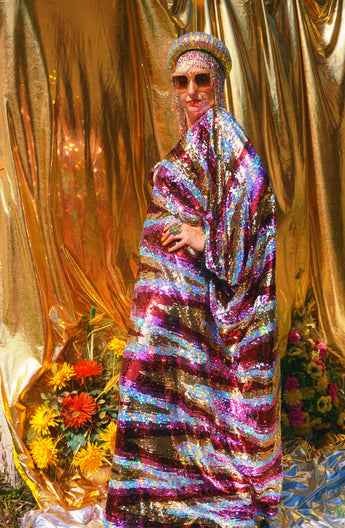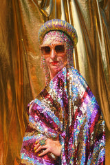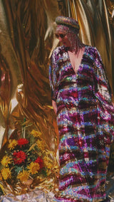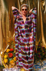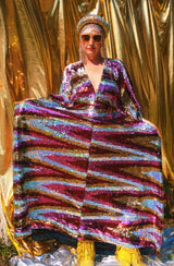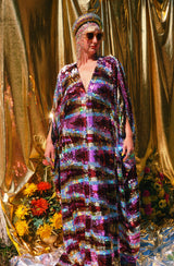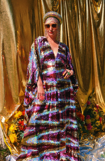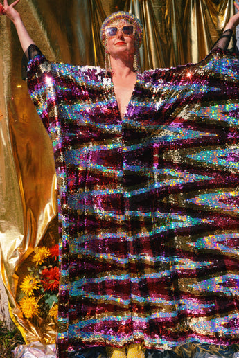 Ziggys Priestess Sequin V-Neck Kaftan Gown. Our famed Ziggy sequins (as seen on stage touring with the scissor sisters!) return with a new colourway! Medium weight with some stretch.