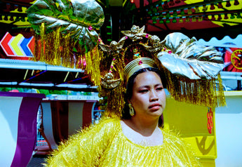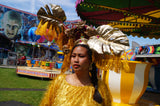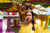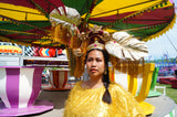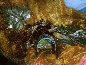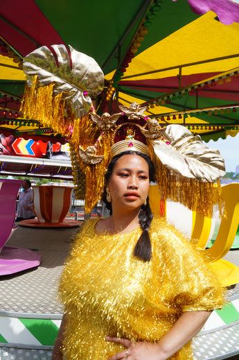 HUGE OTT headpiece made with gold metallic giant leaves spraying off a halo crown. Masses of gold and pink tinsel fringing hang from each leaf anf at the back of the halo and down the side of the head. Hot pink gems and gold cherubs cover the halo, as well as a central lucky gold cat and metallic gold frame positioned above the forehead.
