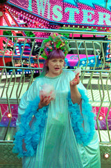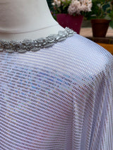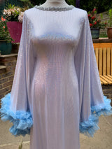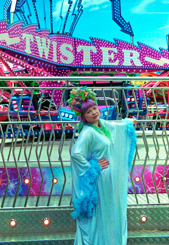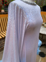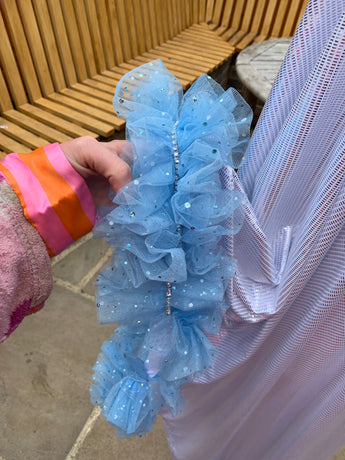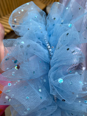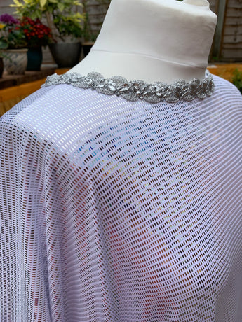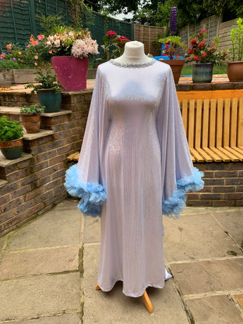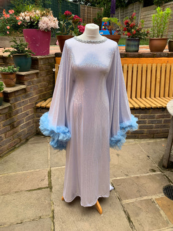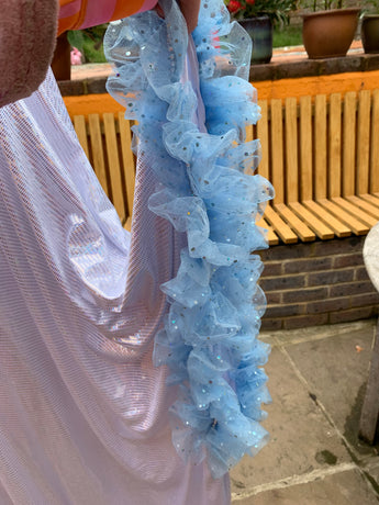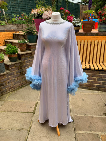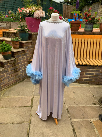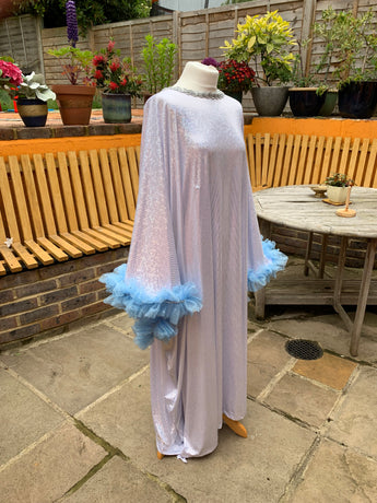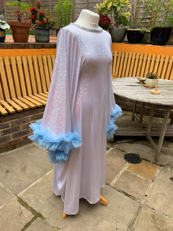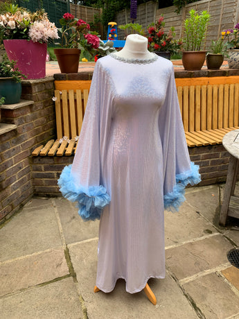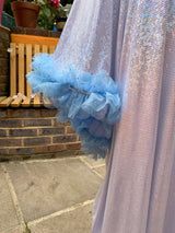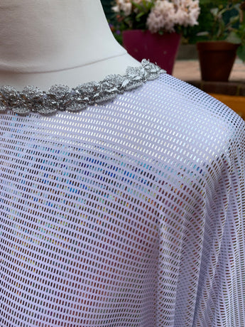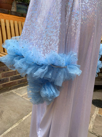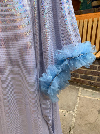 Made from last of the line fabric, this stretch holographic fabric has a silver lurex finish around the neck and hand-stitched holographic blue glitter mesh tulle ruffle sleeves with diamanté effect centre. MEGA OTT one of a kind show-stopping piece.