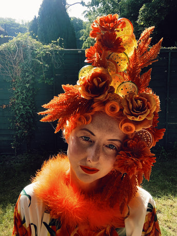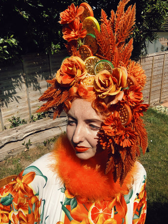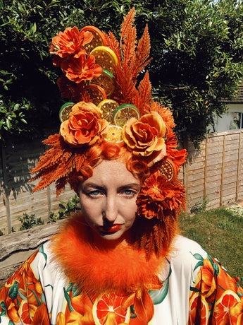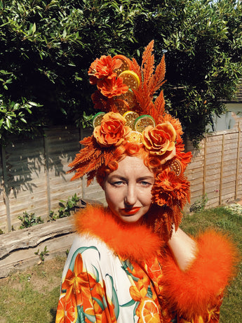 A beautiful Arrangement of vintage plastic orange flowers embedded with slices of oranges, lemons and limes which have all been bejewelled by hand to add a hint of sparkle.