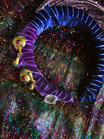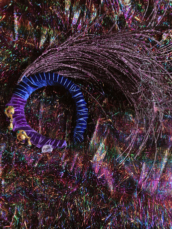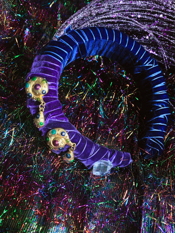 Headpiece made out of purple glitter sparkle sprays which frame the left of the face. Made on a thick padded velvet covered headband with vintage gold and purple dangling jewels down one side.