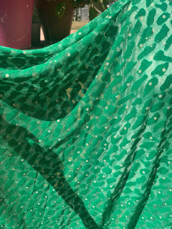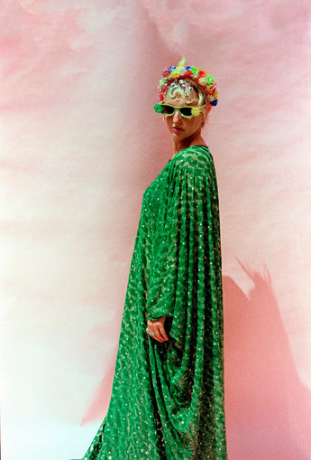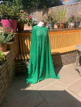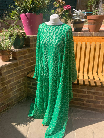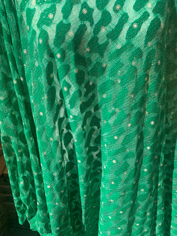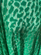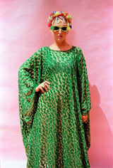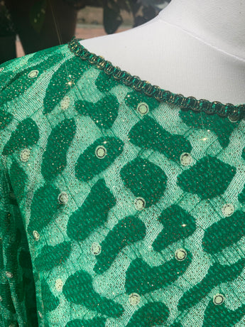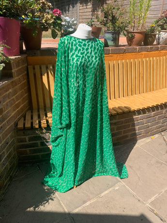 Incredibly sparkly green and gold Kaftan dress in a sheer stretch deadstock tulle fabric. Oozes Glamour.