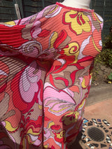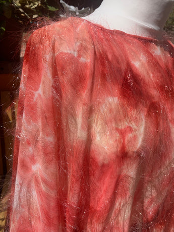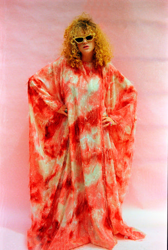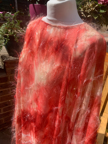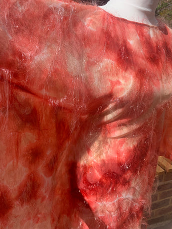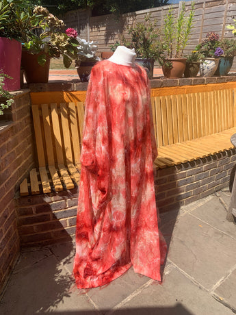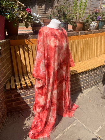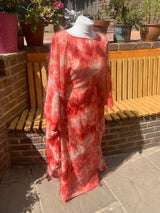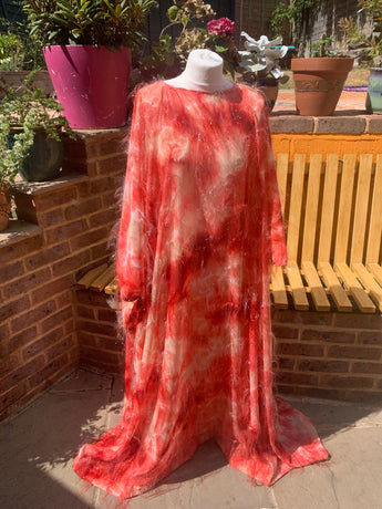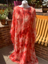 Only 1 available! Gorgeous russet coloured tie-dye chiffon kaftan maxi dress with a feathery "hair" like whispy thread over the top.