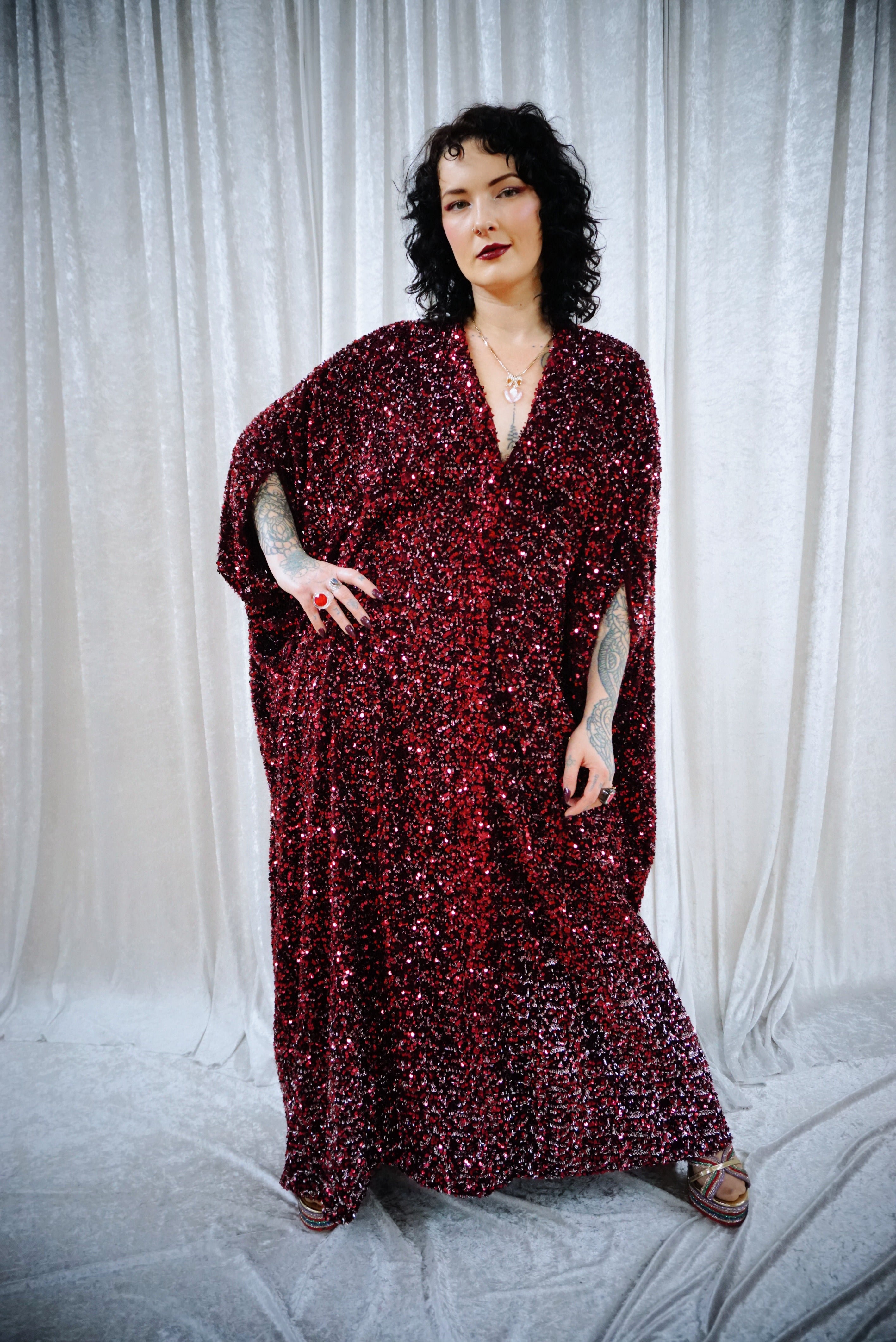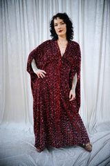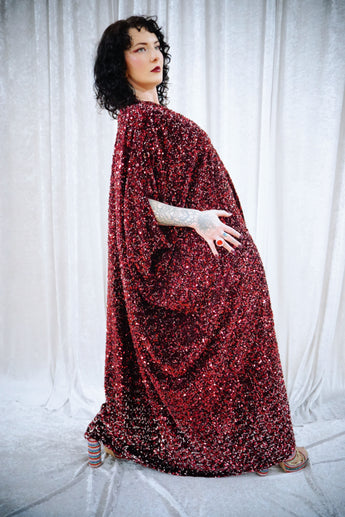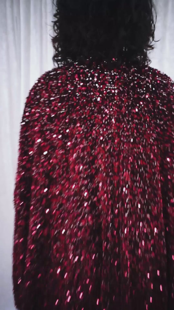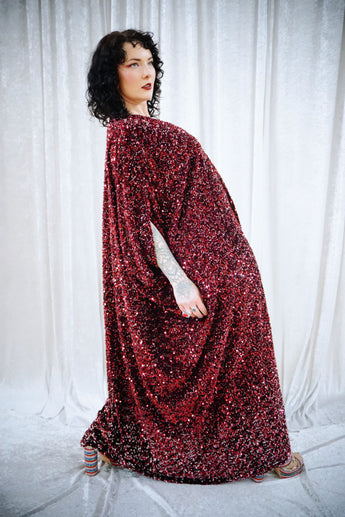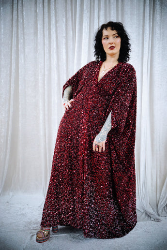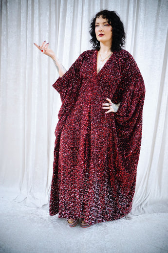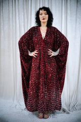 This striking full-length v-neck kaftan gown features an all-over sequin on a thick velvet base in rich red tones, punctuated with subtle silver accents throughout and with an ombre effect towards the bottom. The sequins are extremely unique in an almost curled shape. A heavy but comfortable fabric.