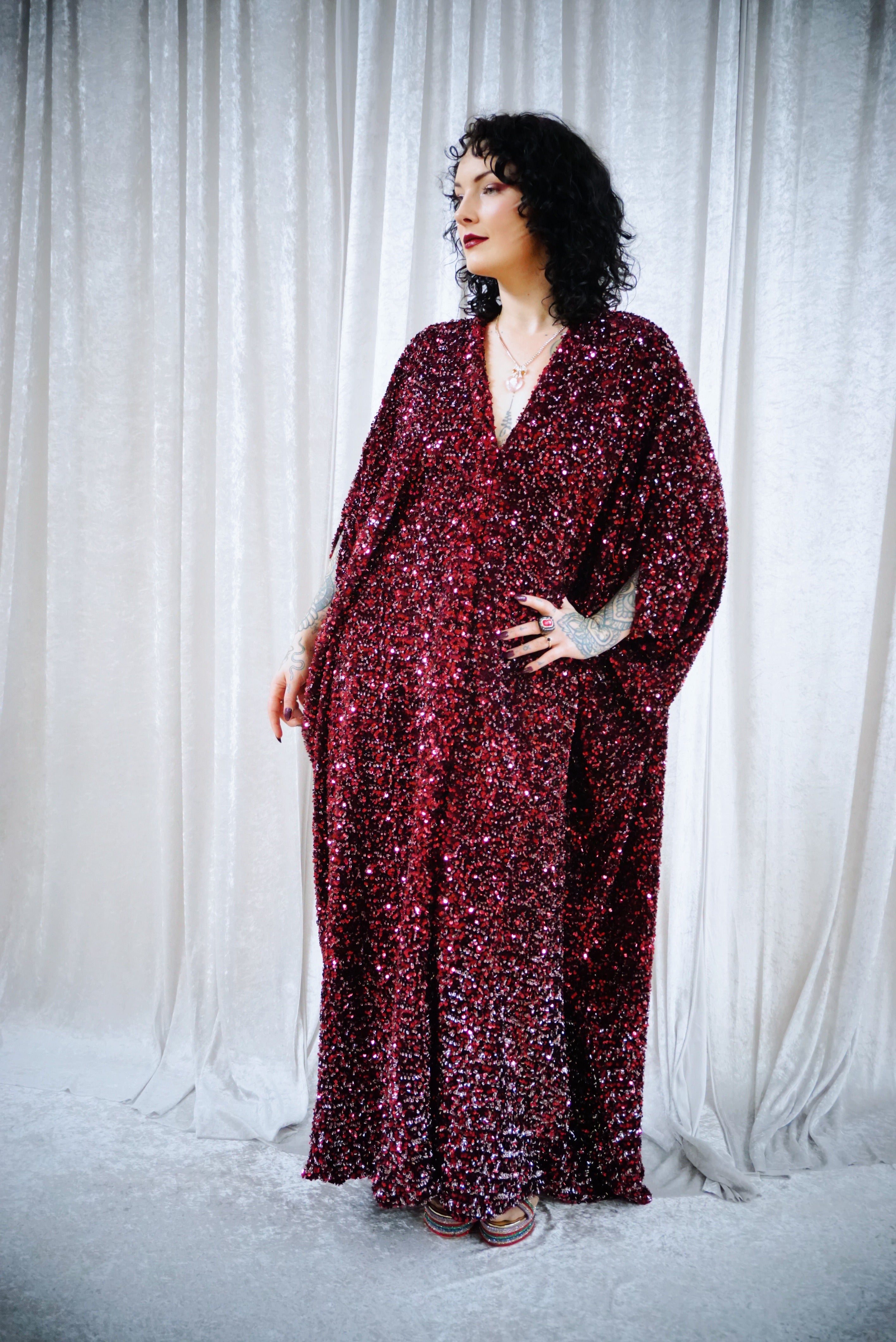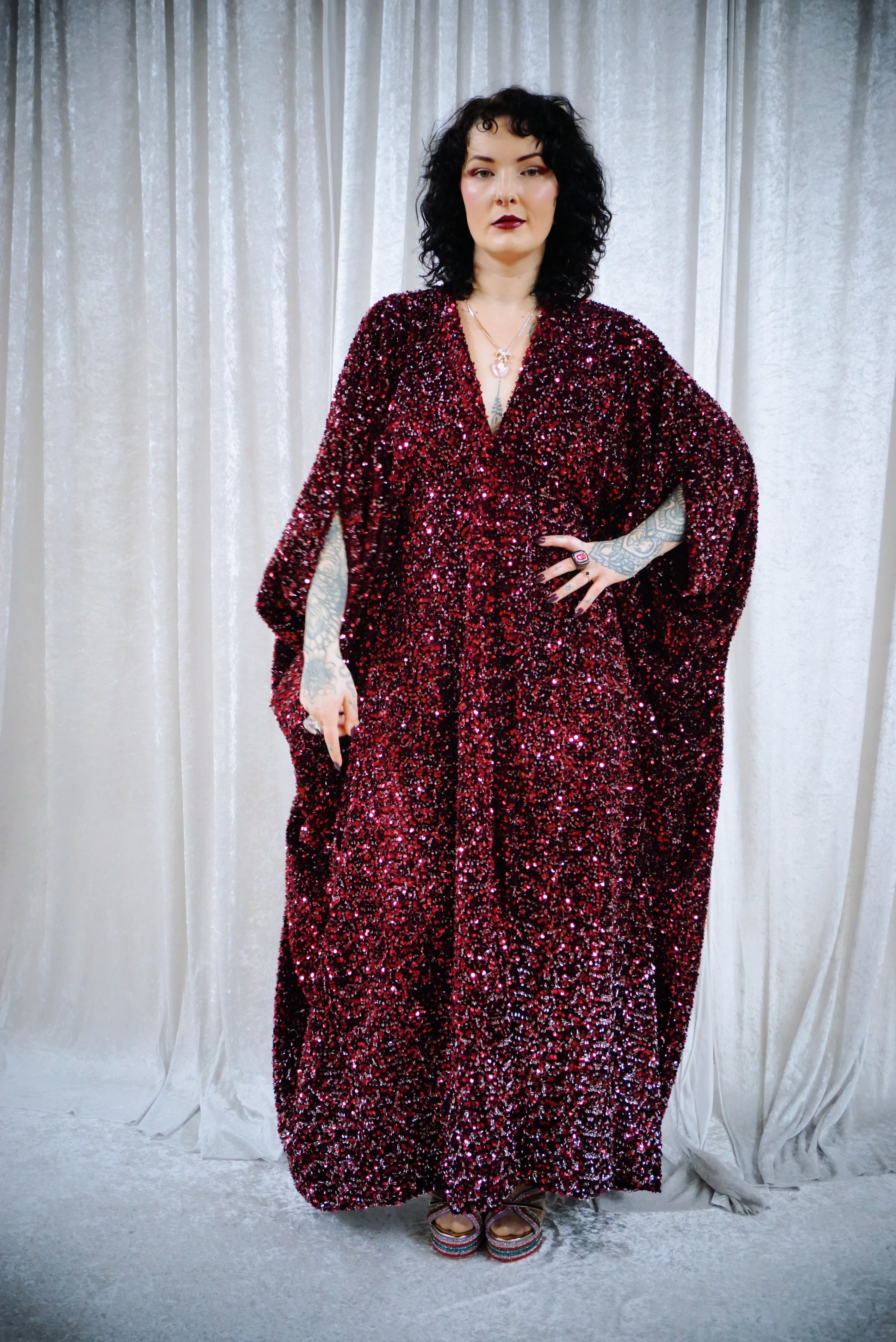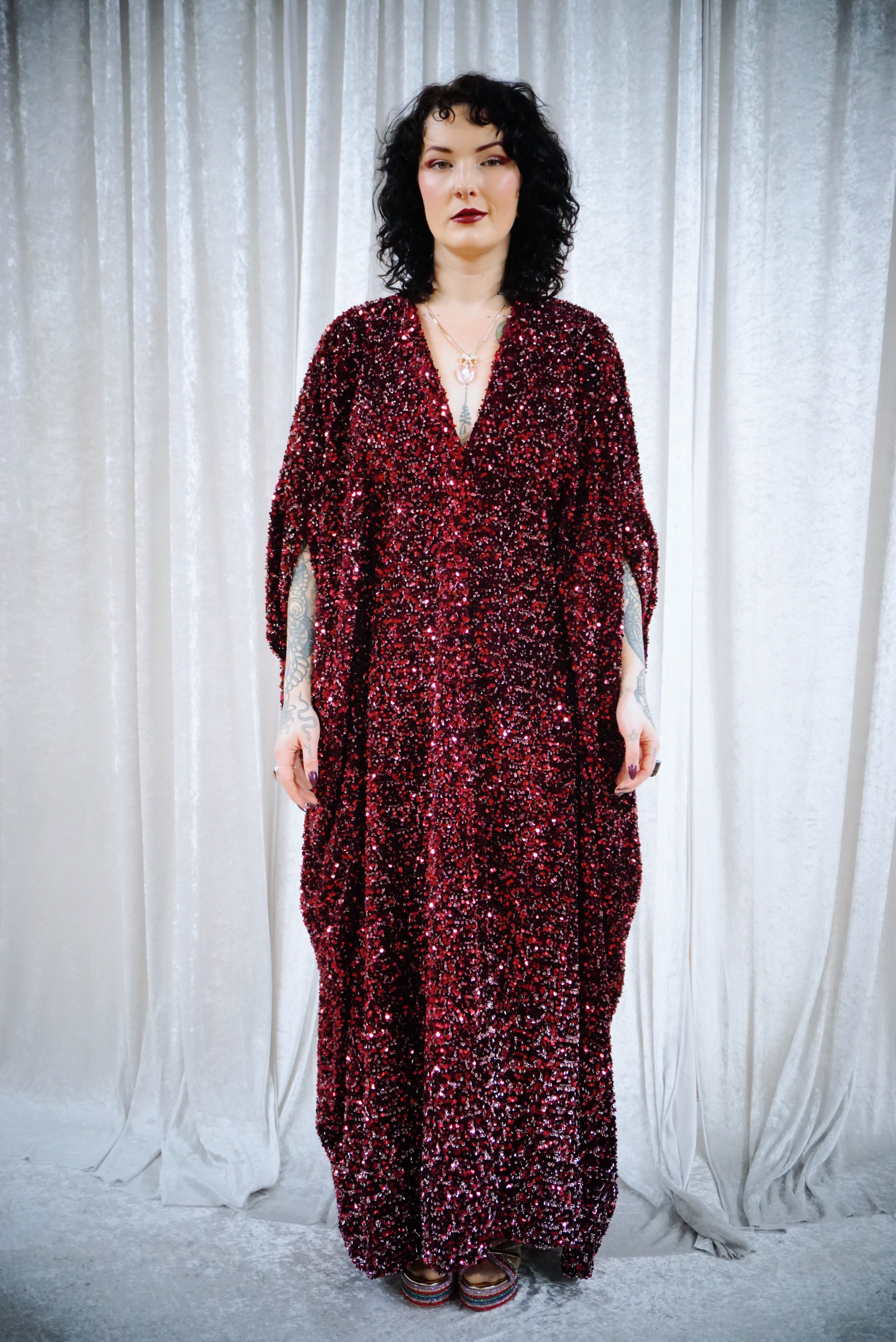 This striking full-length v-neck kaftan gown features an all-over sequin on a thick velvet base in rich red tones, punctuated with subtle silver accents throughout and with an ombre effect towards the bottom. The sequins are extremely unique in an almost curled shape. A heavy but comfortable fabric.