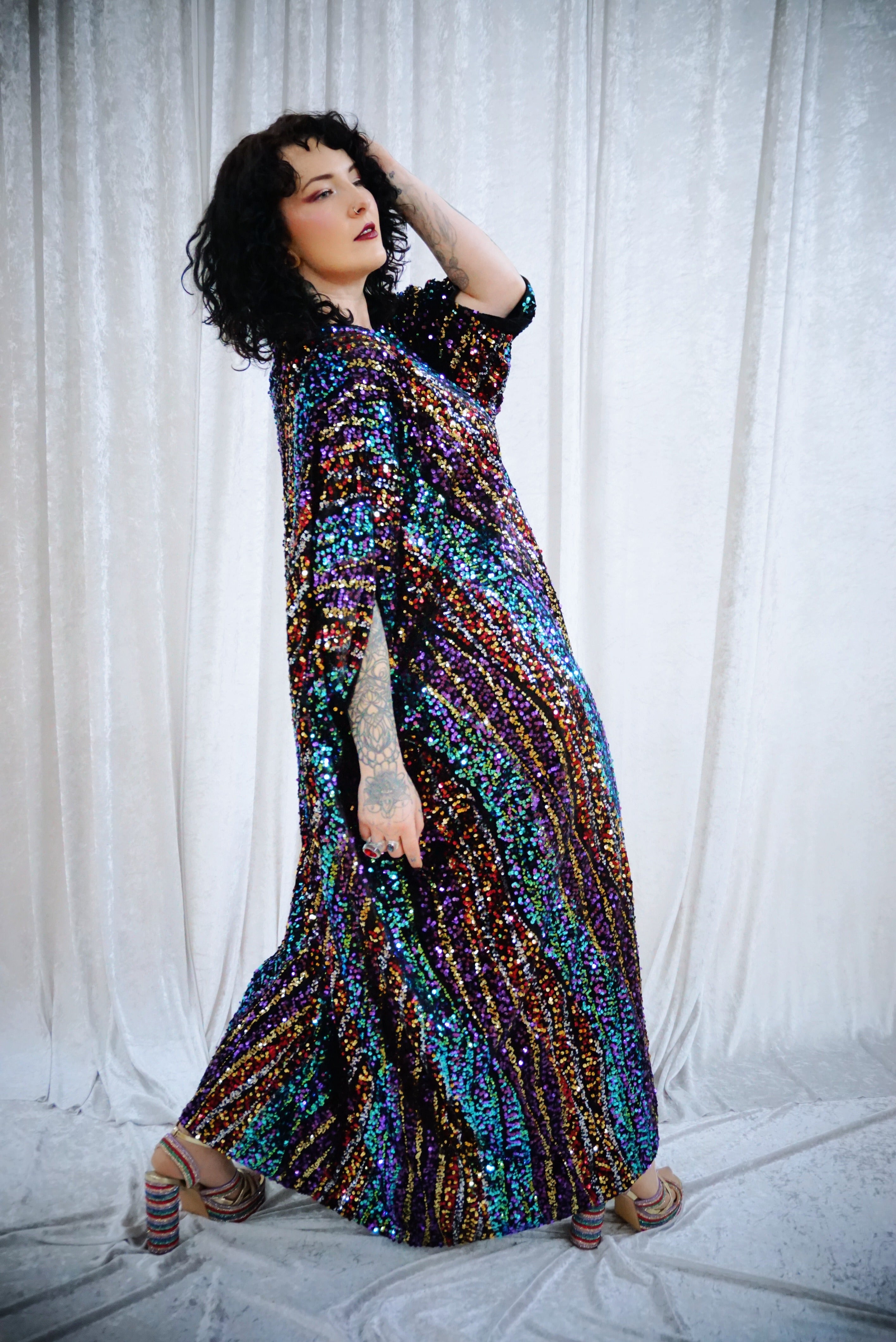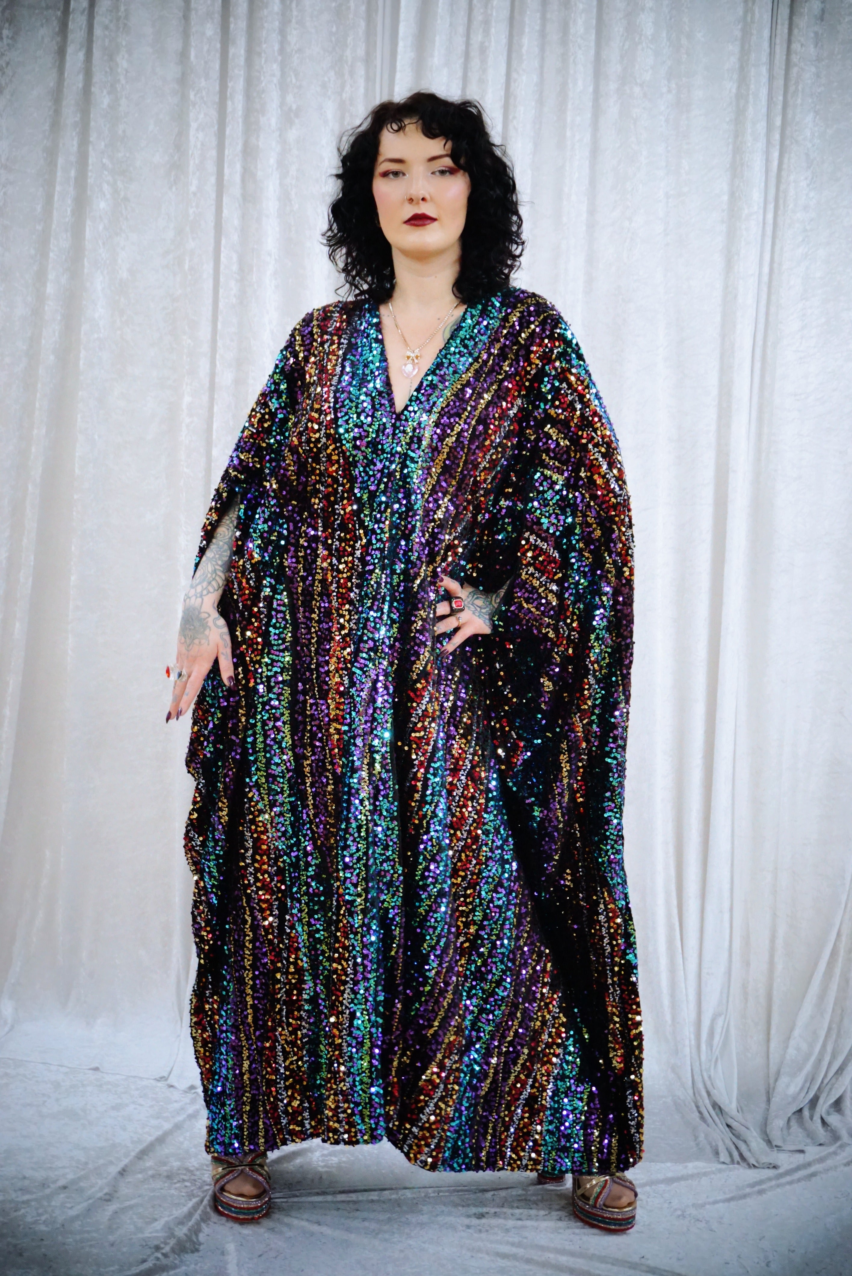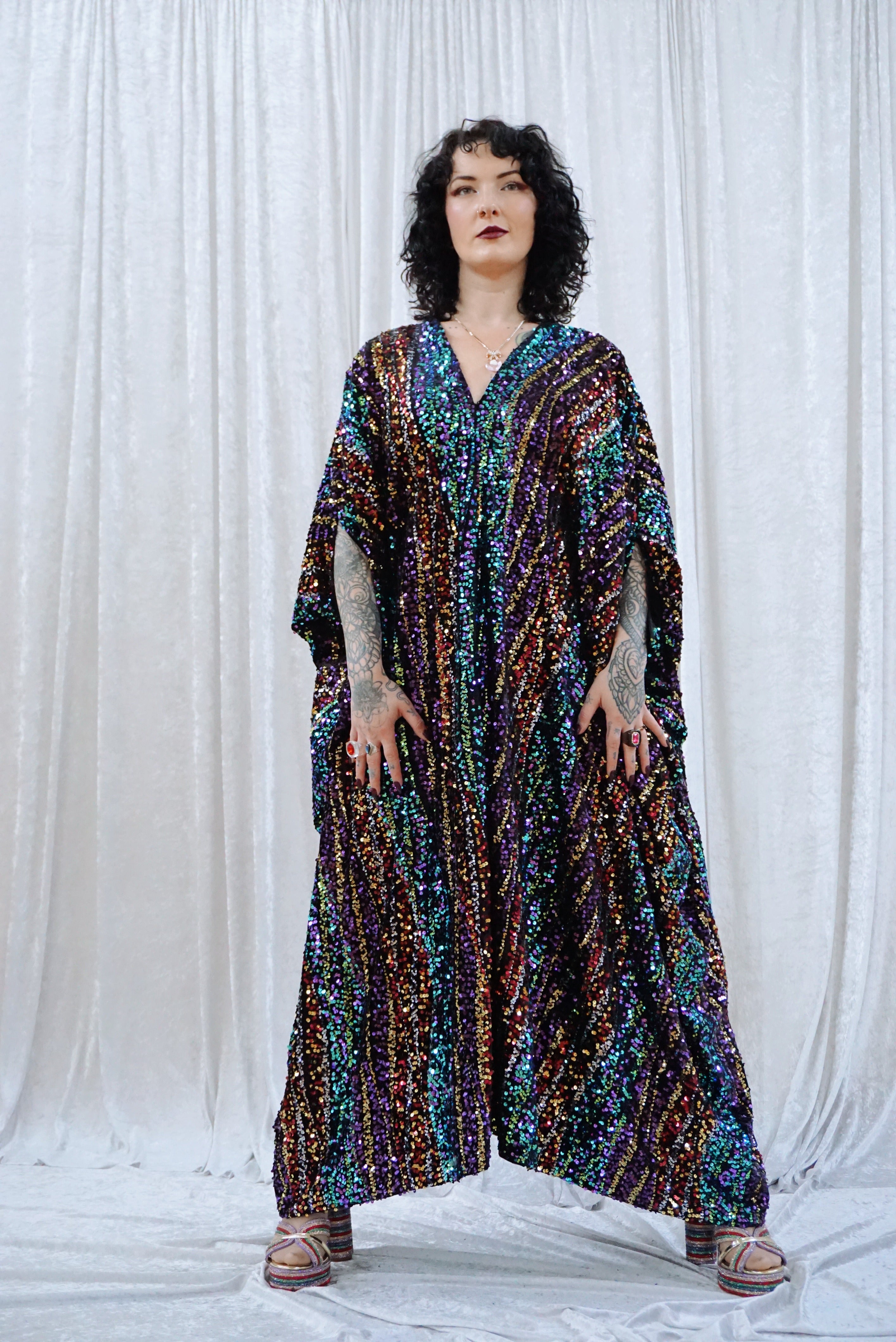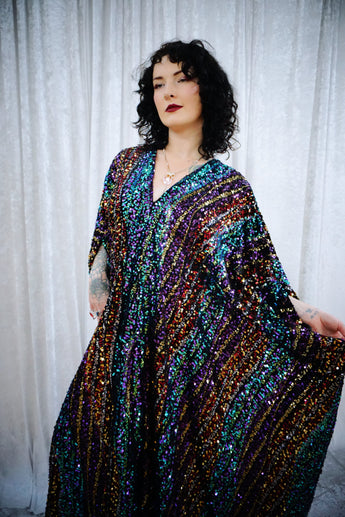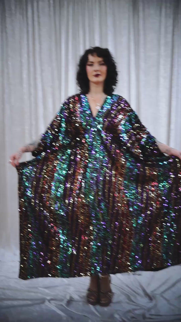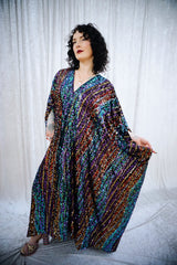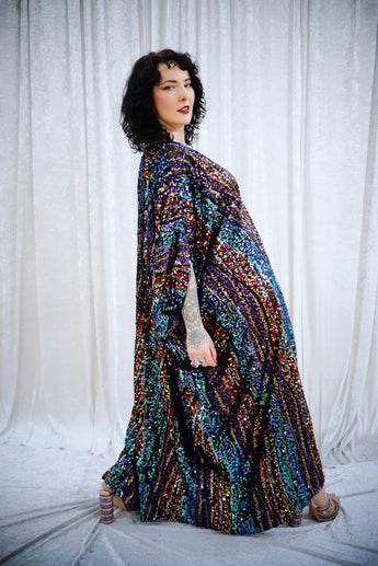 This striking full-length Mixed Signals v-neck kaftan gown features flowing bands of multicoloured sequins on a black velvet base.