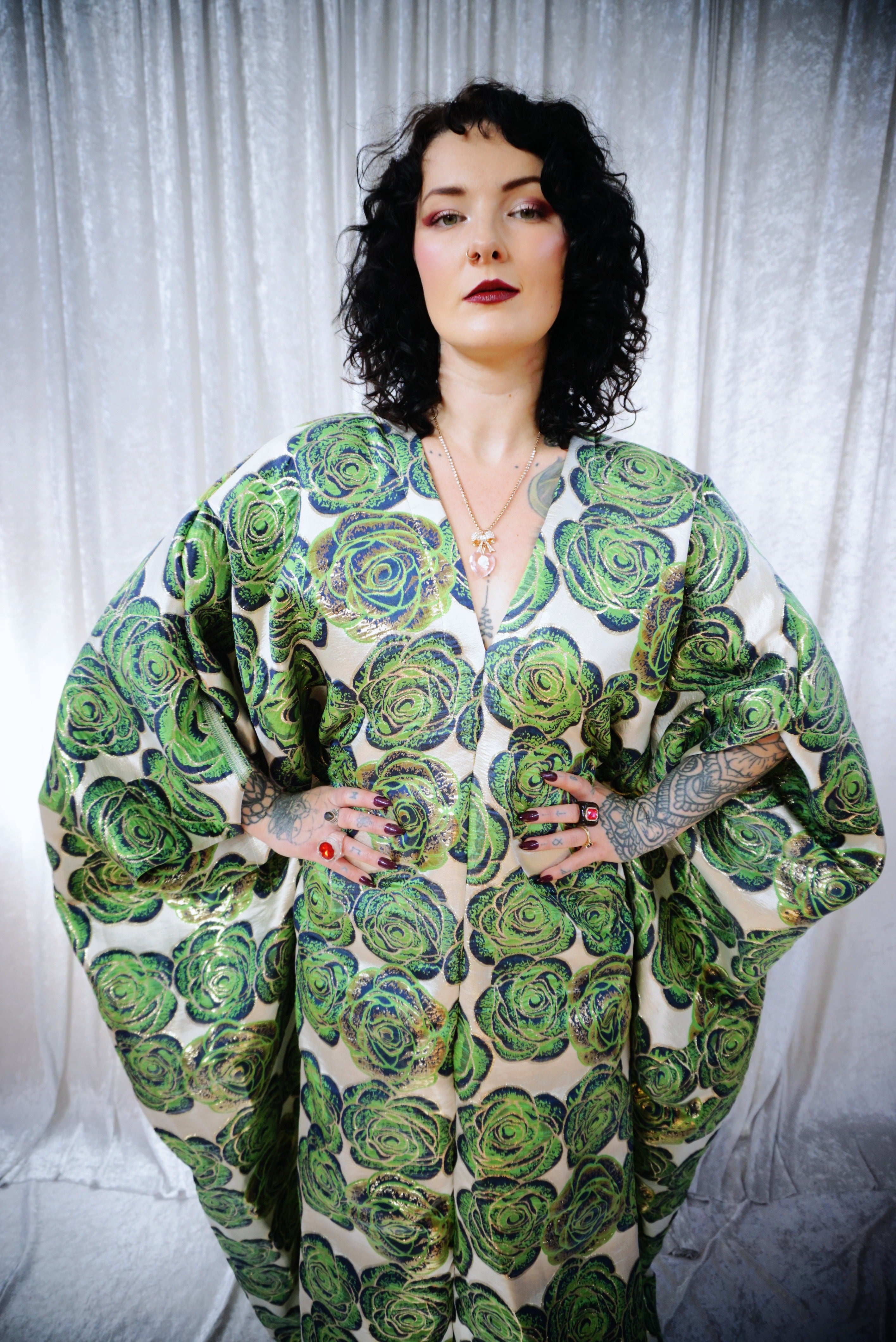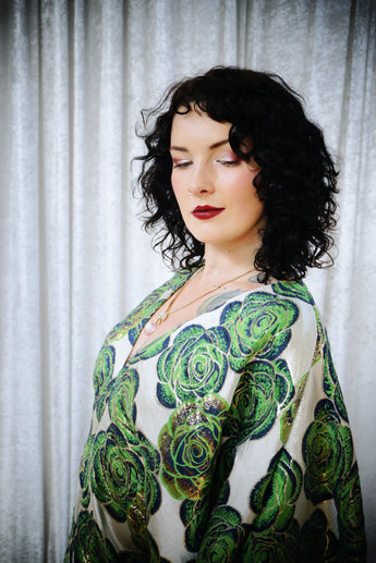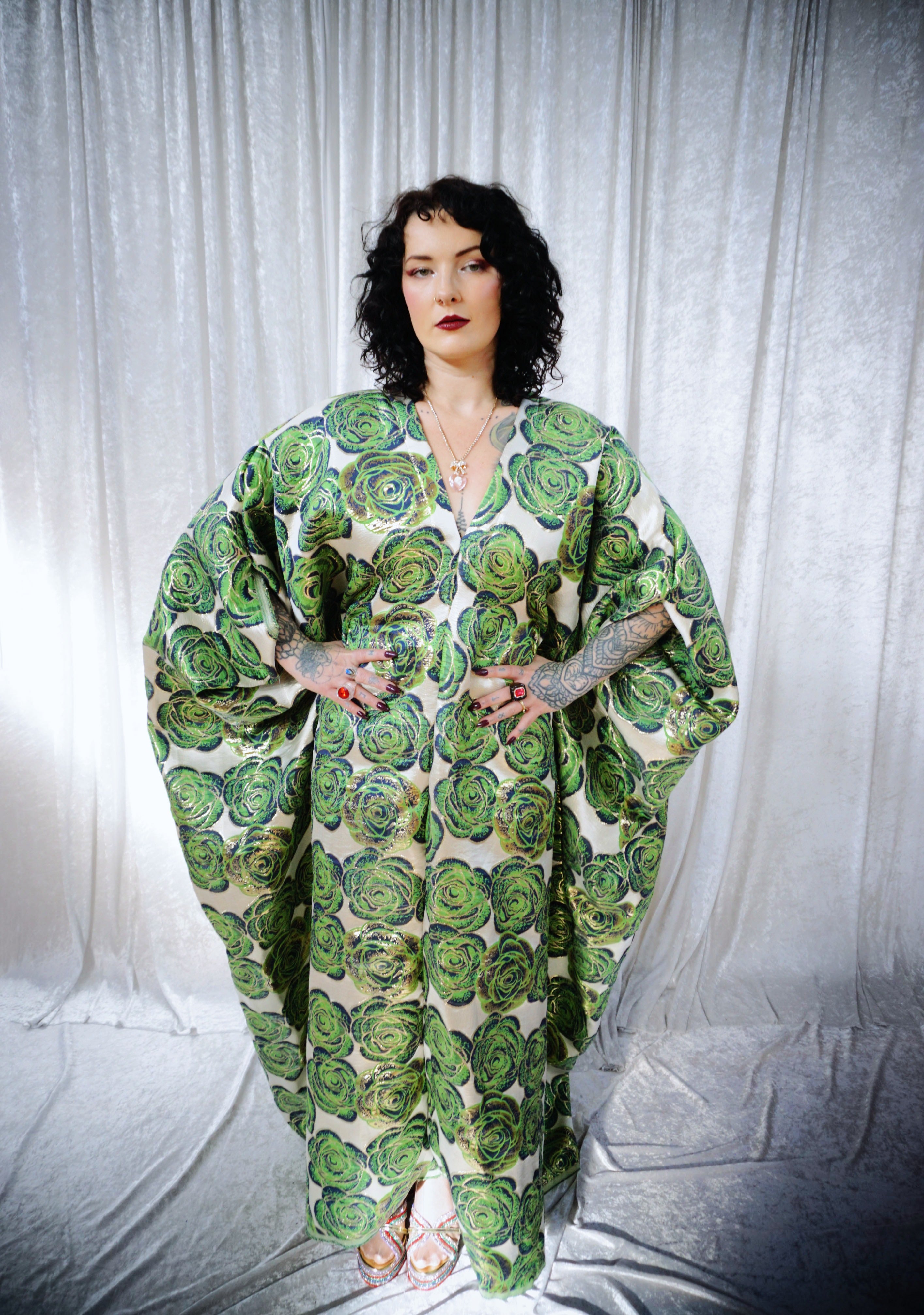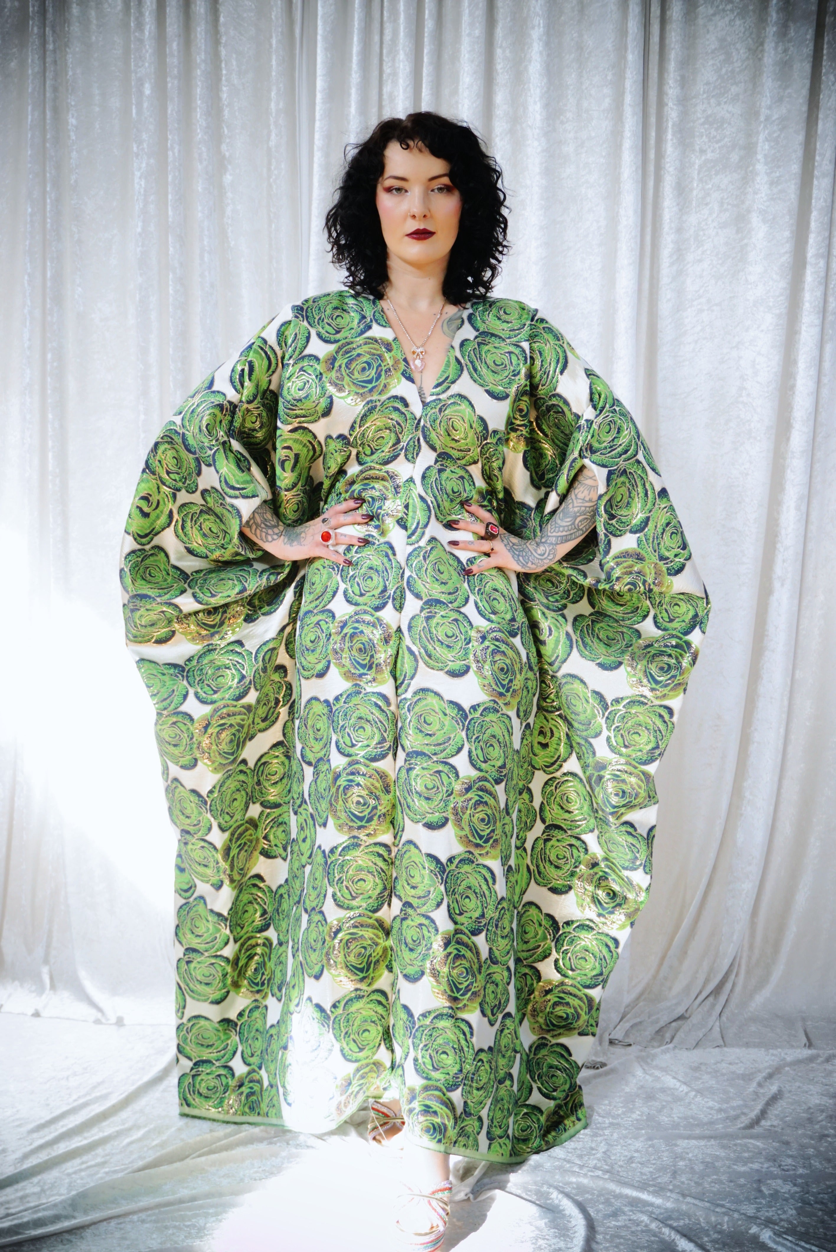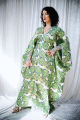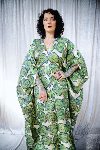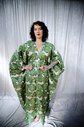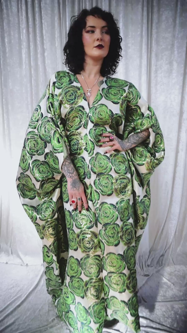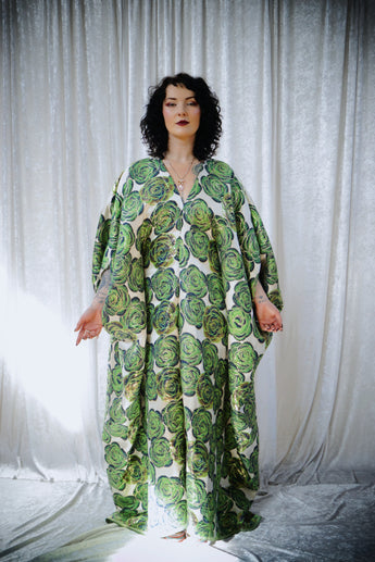 This striking full-length Poison Garden v-neck kaftan gown features green roses with metallic gold print on a lightweight brocade fabric. Available in a range of colourways.