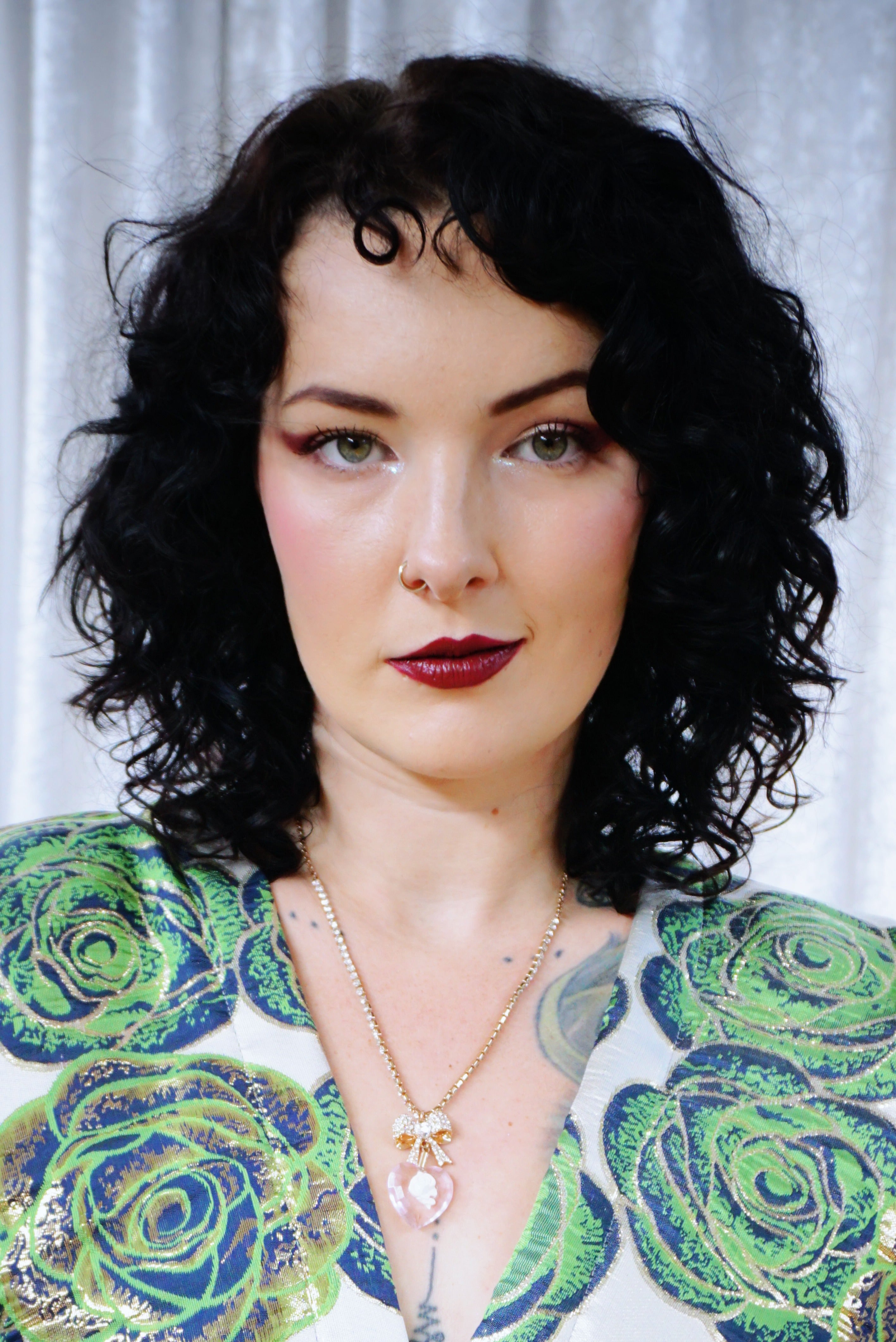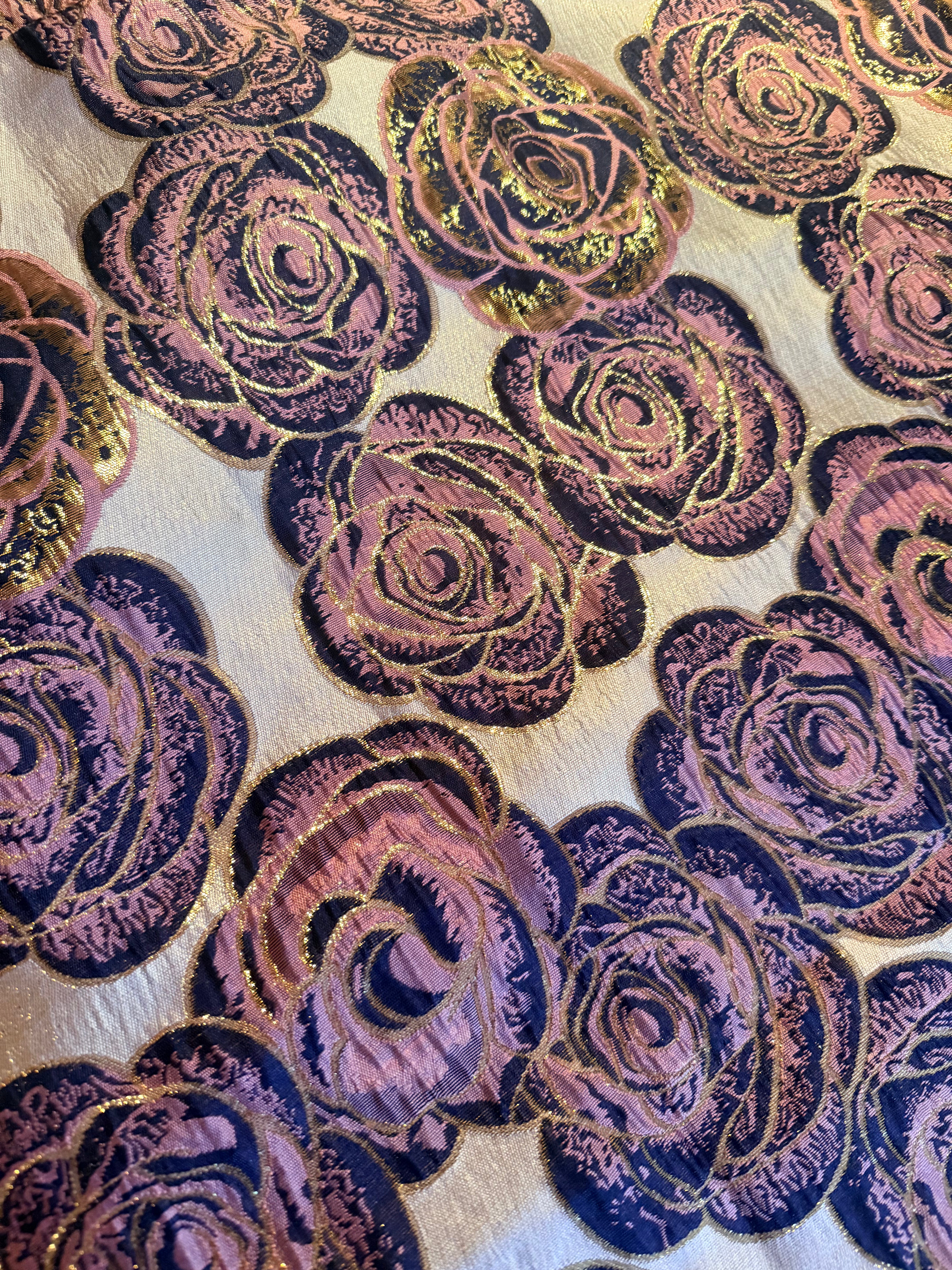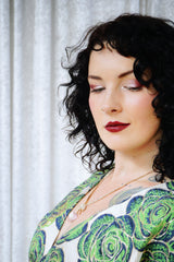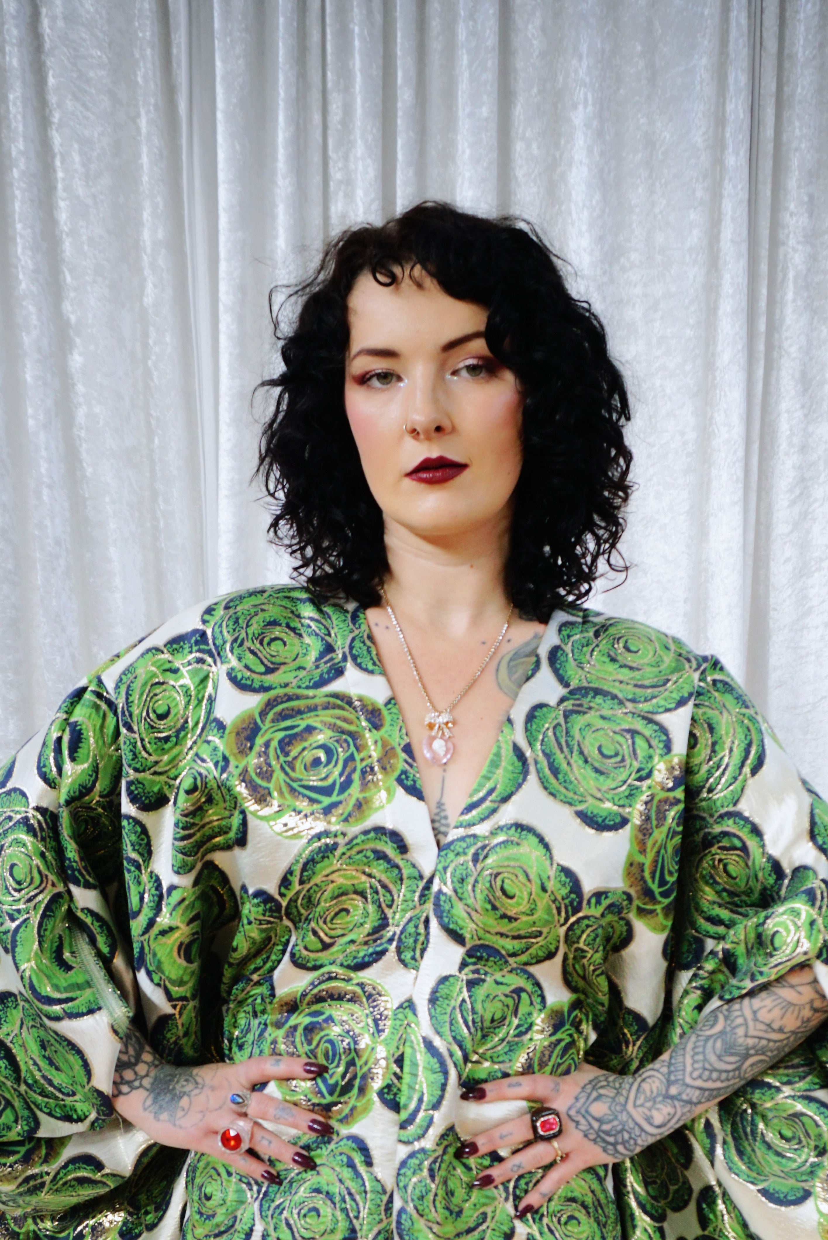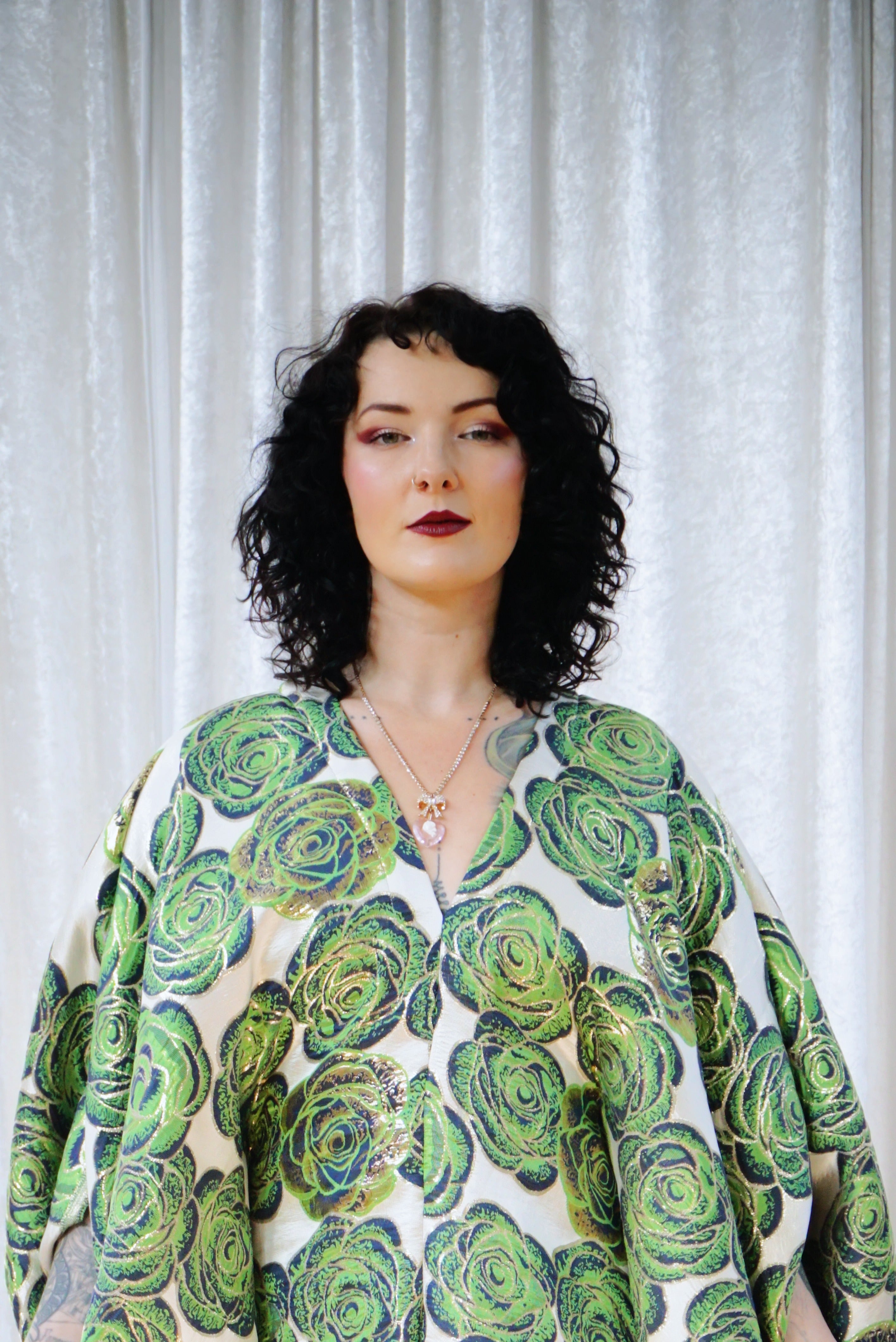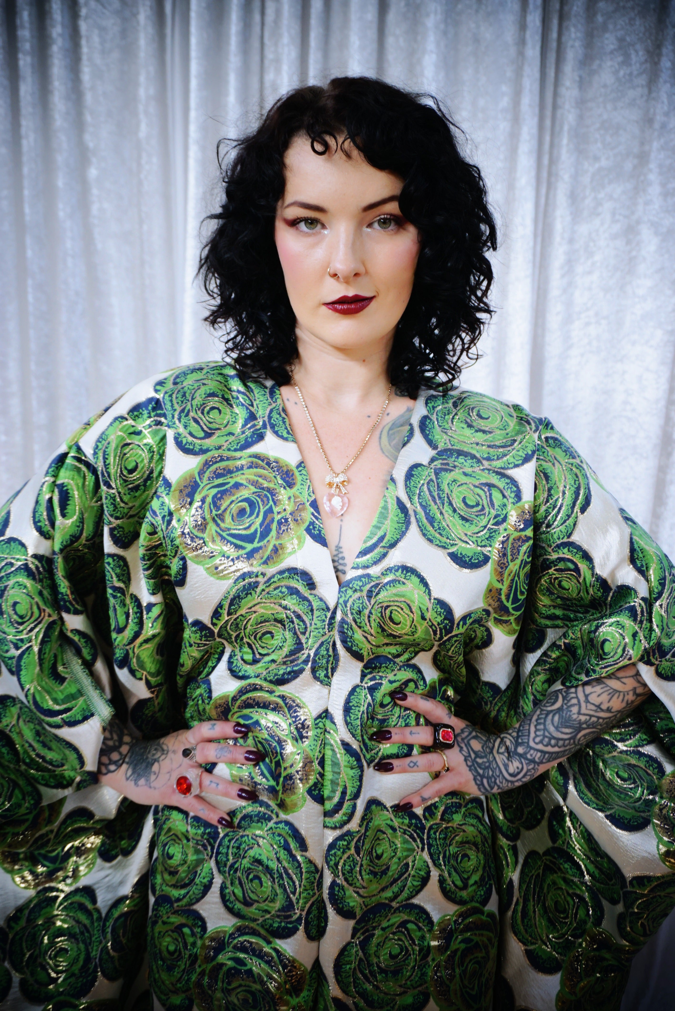 This striking full-length Poison Garden v-neck kaftan gown features green roses with metallic gold print on a lightweight brocade fabric. Available in a range of colourways.