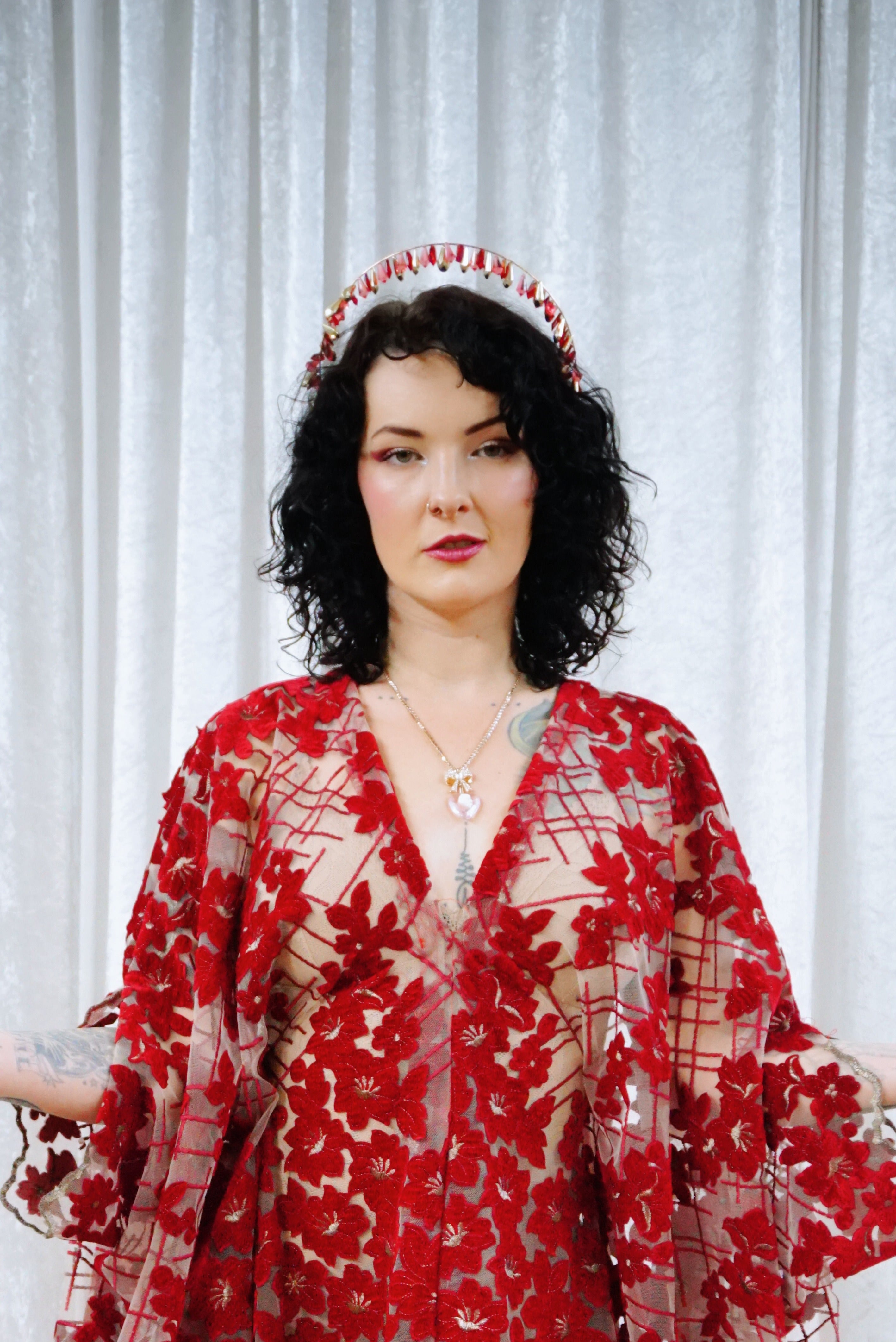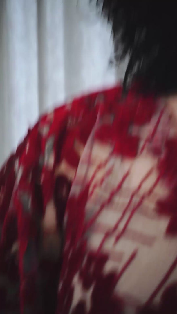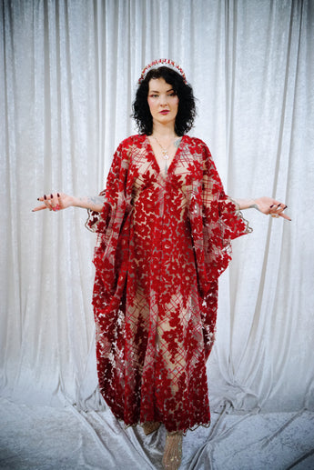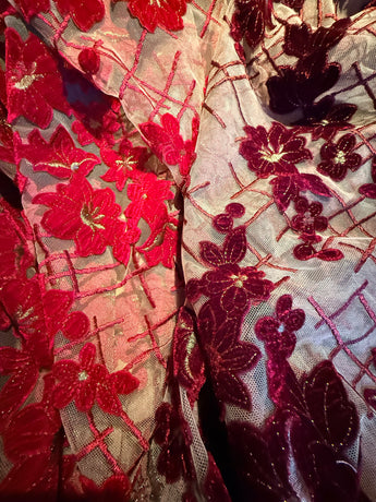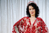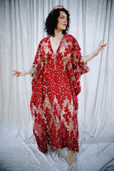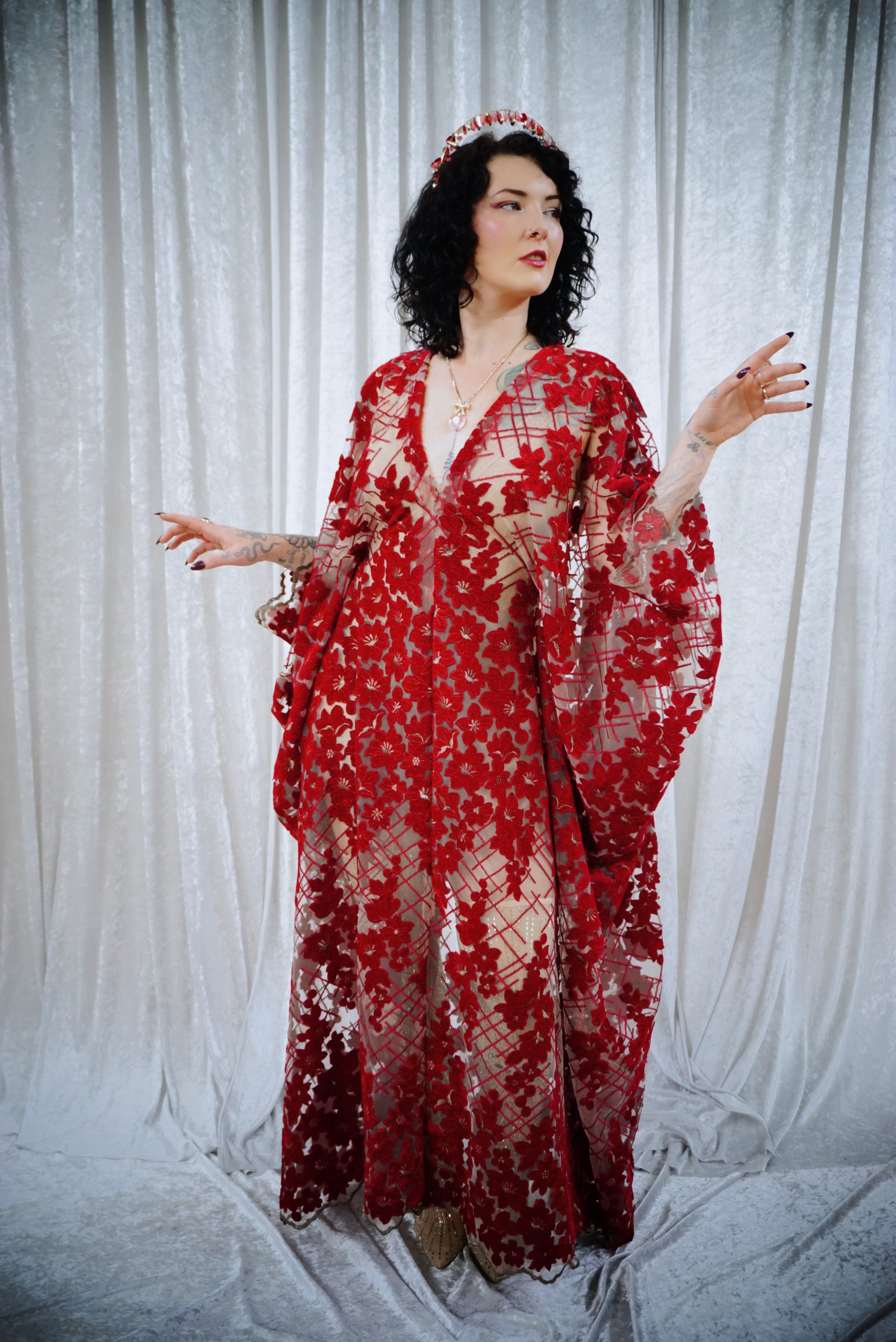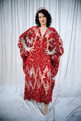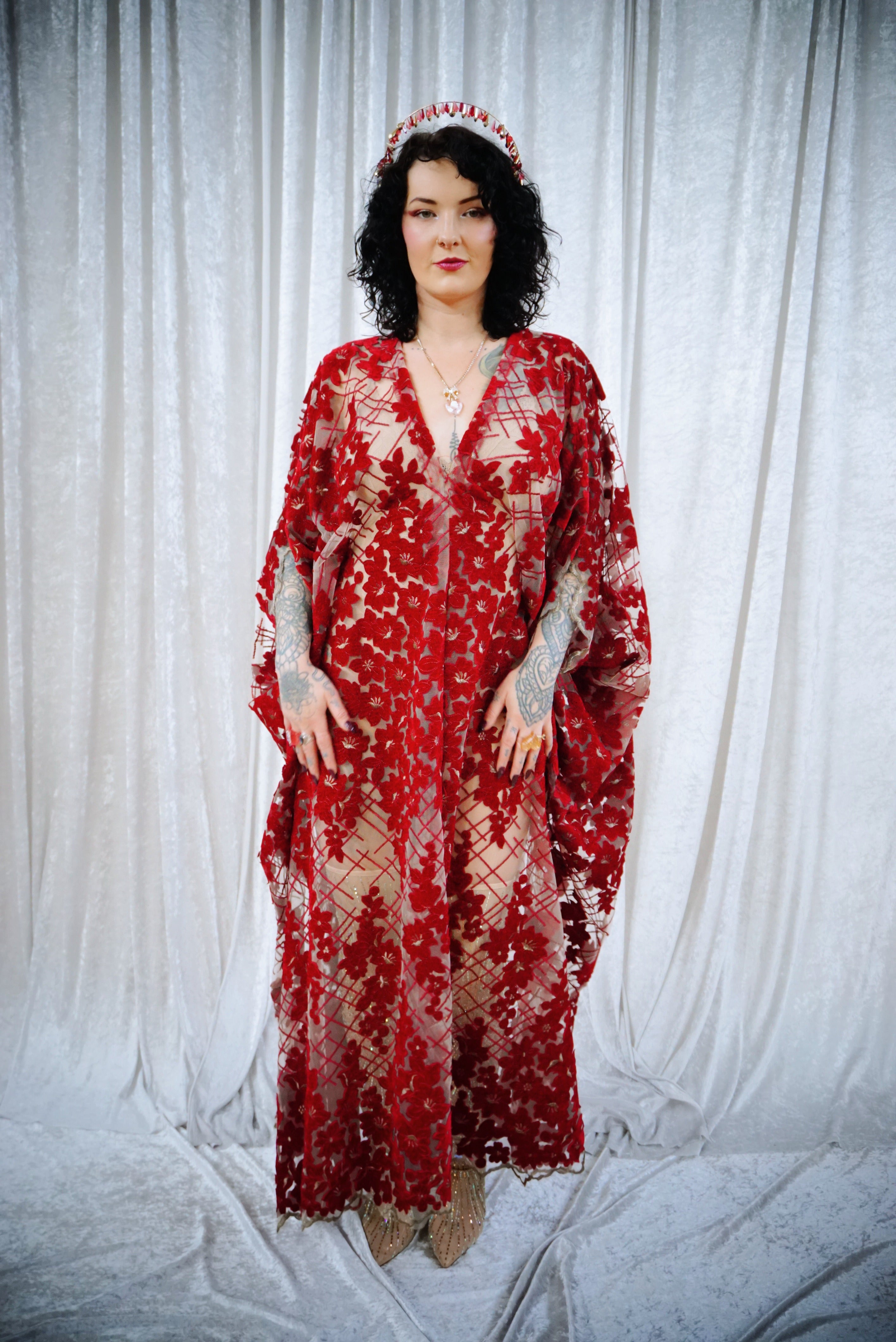 Red Flocked Velvet Sheer V-Neck Kaftan Gown features a fine mesh base with raised velvet florals throughout. The perfect level of sheerness. Available in a range of colourways.