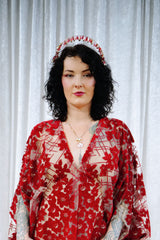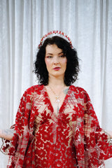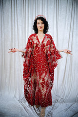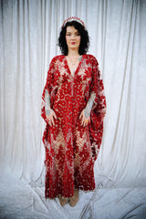 Red Flocked Velvet Sheer V-Neck Kaftan Gown