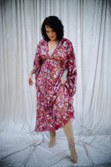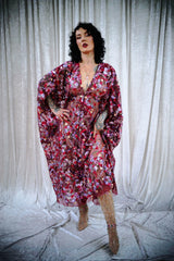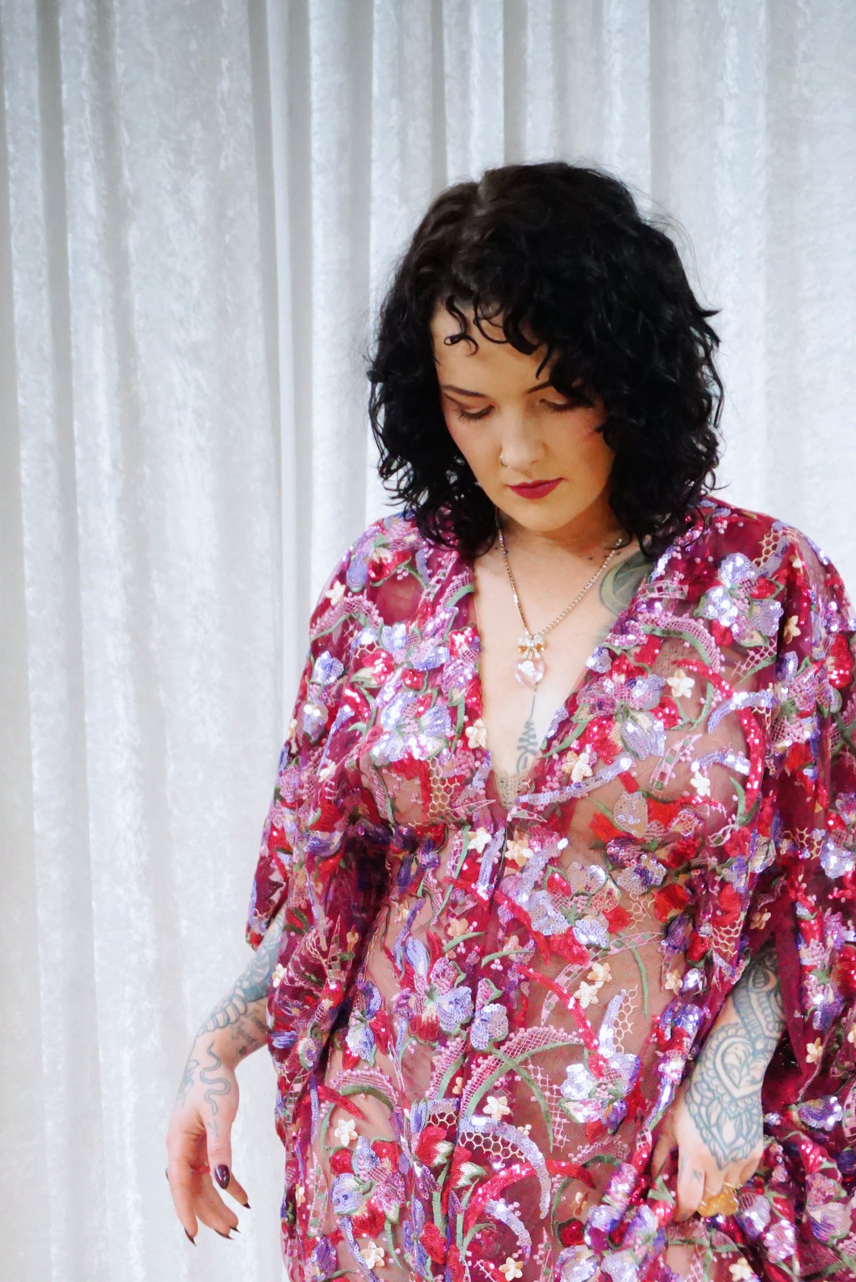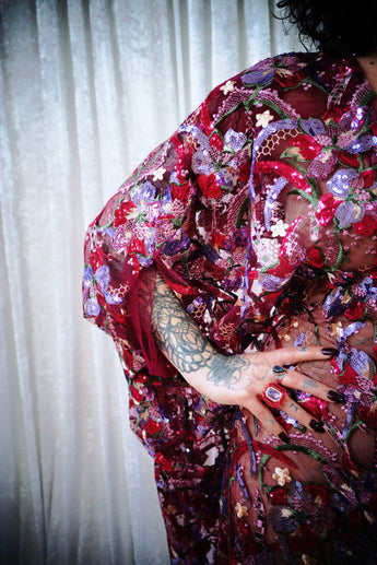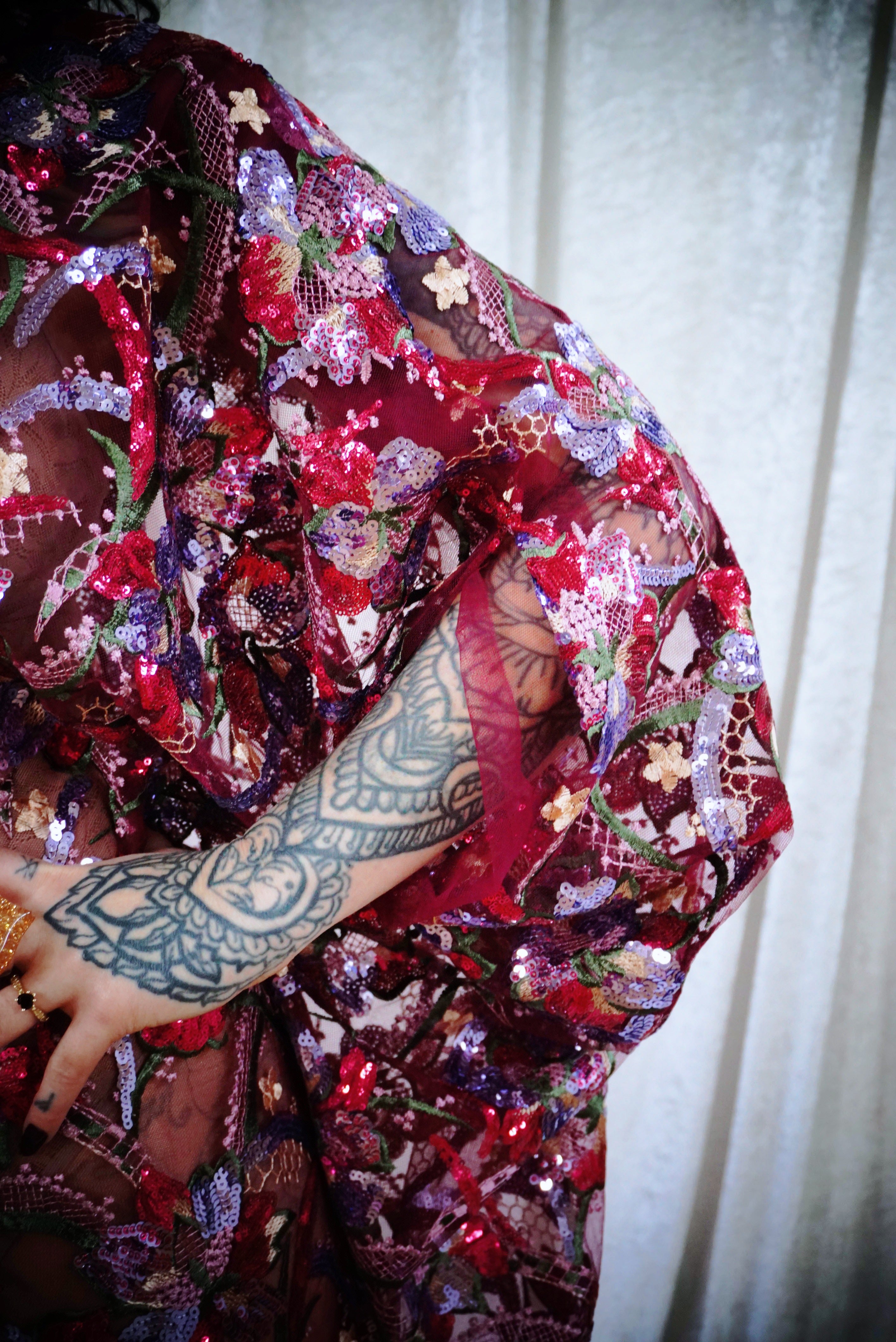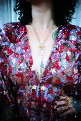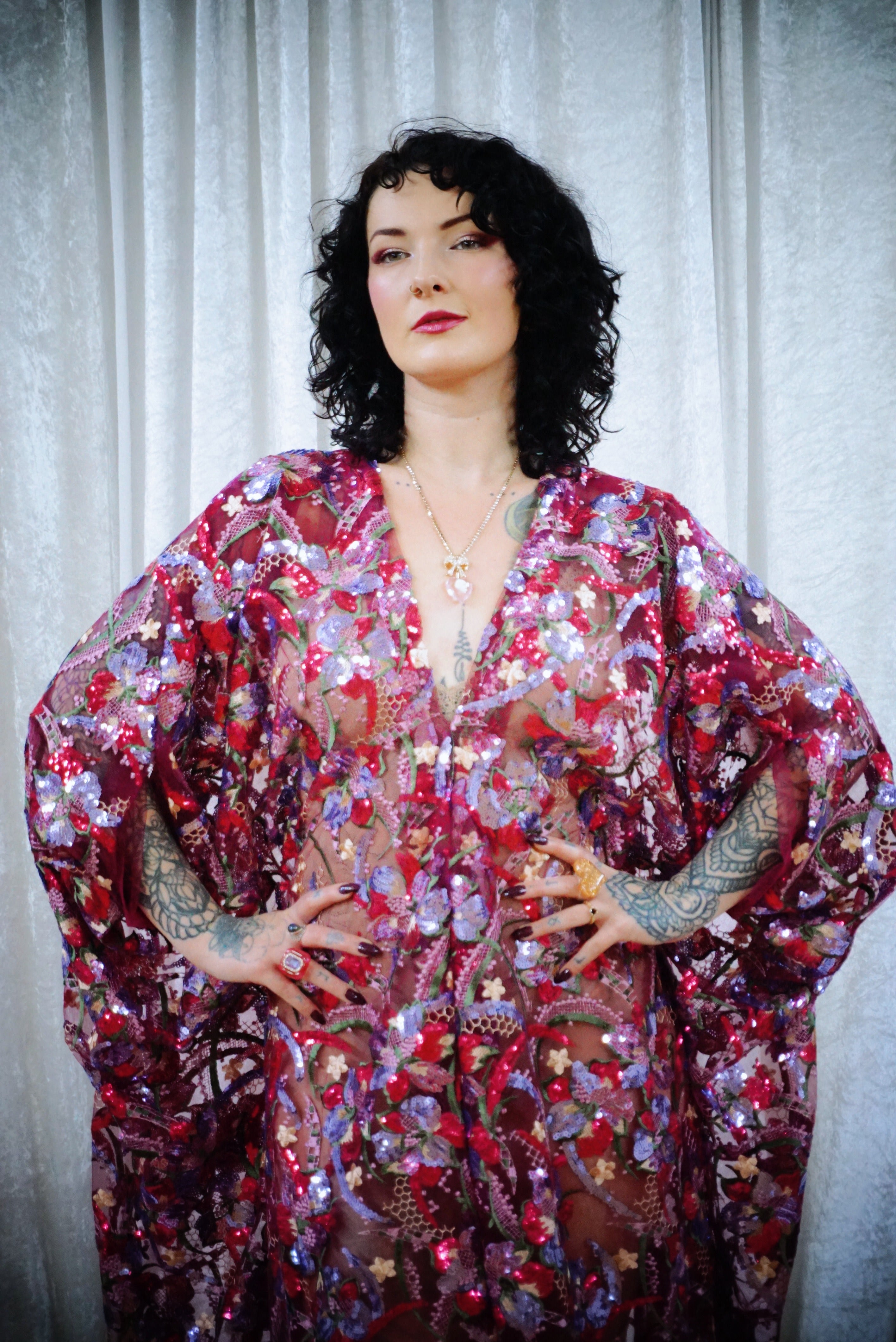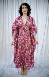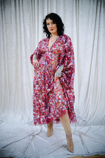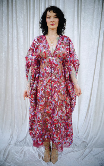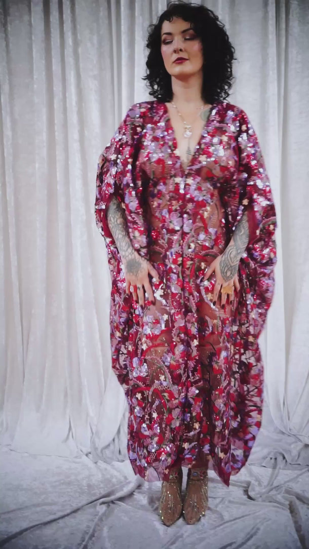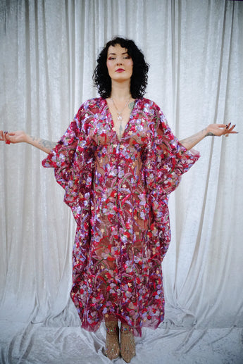 Petal To The Metal Sheer Sequin V-Neck Kaftan Gown features a tulle mesh base with beautiful sequinned and embroidered flowers scattered across the dress and a scalloped edge finish. Please be aware that this dress is sheer and can be worn with a slip or your favourite lingerie.