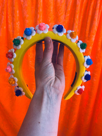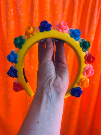 Original 60s hair bobbles in a rainbow of colours attached to a padded bright headband. This design is on a yellow headband with two different styles of flowers front and back, making it reversible. Super fun, cute and Kitsch.