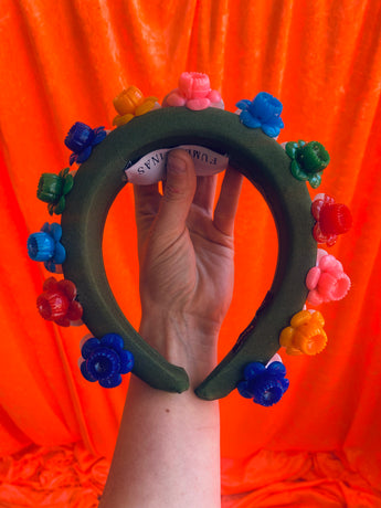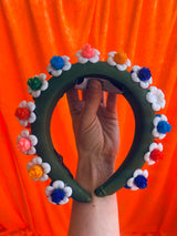 Original 60s hair bobbles in a rainbow of colours attached to a padded bright headband. This design is on a olivegreen headband with two different styles of flowers front and back, making it reversible. Super fun, cute and Kitsch.